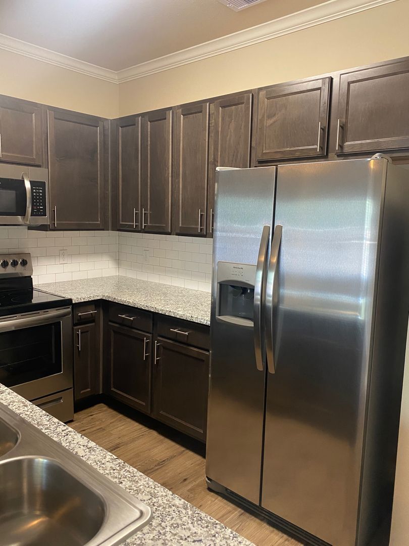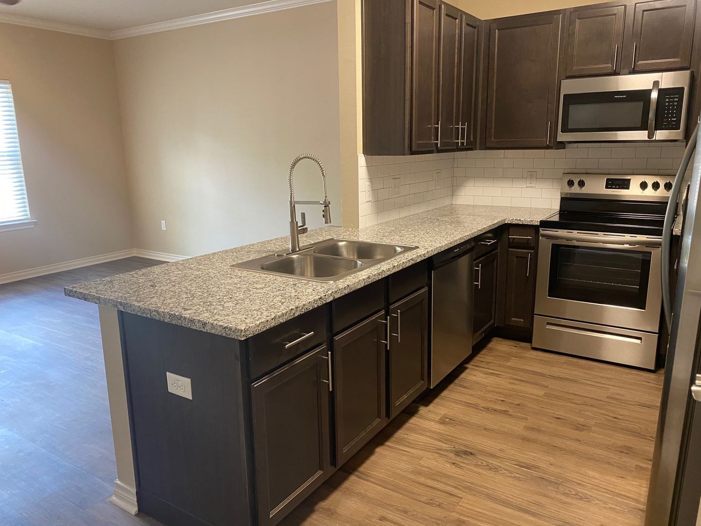 The interior of unit is beautifully built in 2020 to fit your upstyle living needs. All units are large and inviting. Unit interiors have gorgeous silver fixtures, modern style dark cabinets, stainless steel sinks, stainless appliances, white faux-wood blinds create a beautiful, granite countertops throughout the units, subway style backsplash in the kitchen, with a stylish backdrop to hang your belongings. All first-floor units have wood floors throughout the unit while the second-floor units have wood floors in the living/wet areas and carpet in each bedroom. Each home offers full size washer and dryer connections in each unit. Don't have a washer and dryer set? No problem, We have some info from different companies that can help you rent a set! The kitchen comes with all appliances including and over the stovetop microwave. The dining room is off of the kitchen in a private nook that flows into the living room area. There are plenty of cabinets in the kitchen to store all your cooking essentials and plenty of wall space in the living area to create the home of your dreams. Each home has a front door entry and a backyard/patio exit.