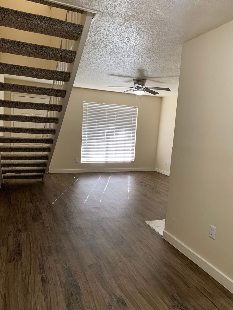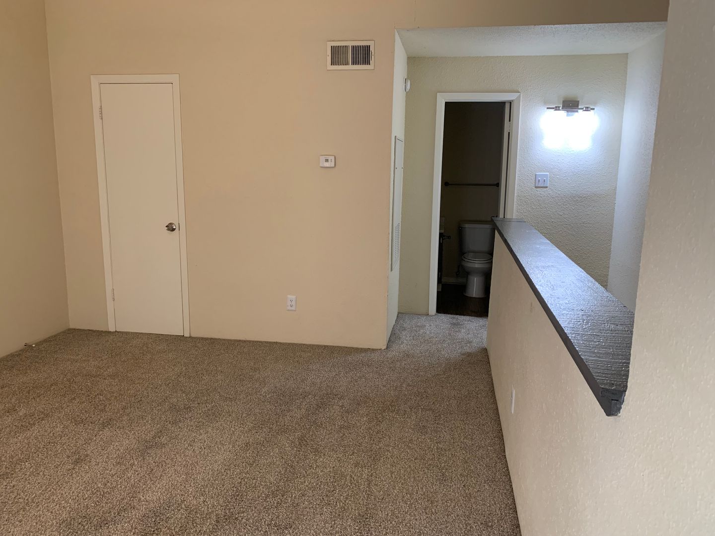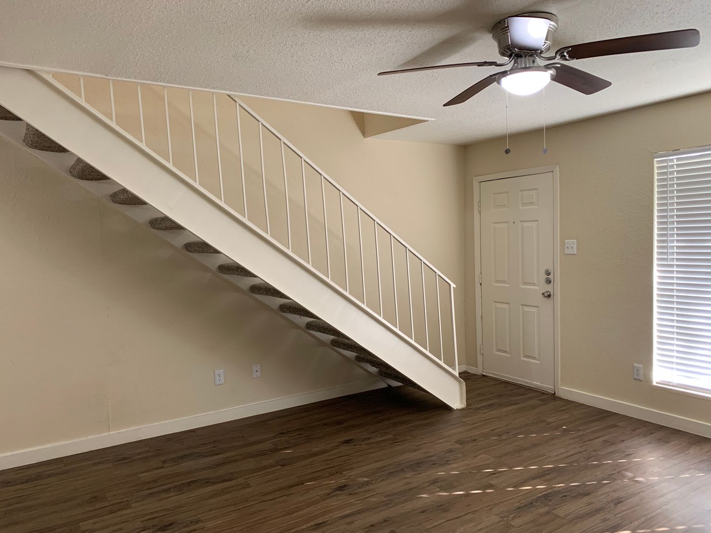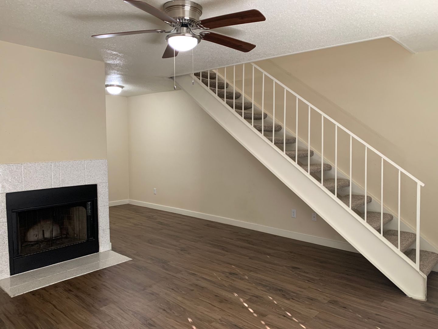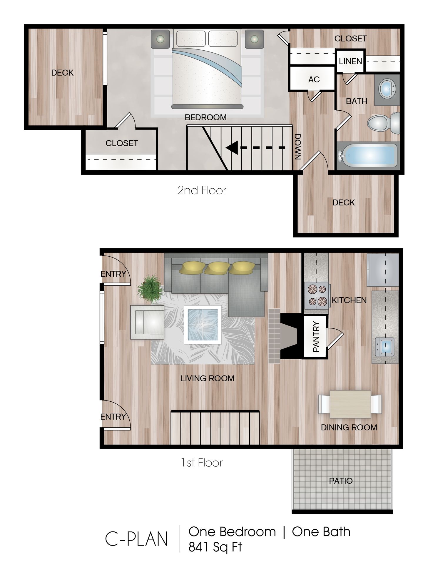 Last but not by far least is our 1-bedroom, 1-bath townhomes. These give you the feeling of a private home with 841 sq. foot of complete privacy. Our townhomes are open concept with the living room, dining room, and kitchen downstairs and the bedroom and 2 closets upstairs. The living room features a fireplace in the center to give many options to make this space your own. There is a large balcony to enjoy a warm cup of coffee or listen to the birds sing in the evening. This floor plan allows you the freedom to not worry about neighbors above or under you; it is nice and quiet at all times.
