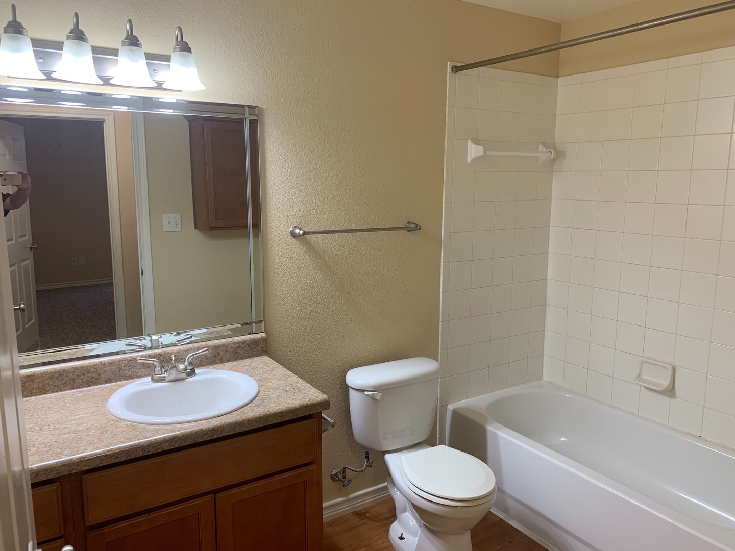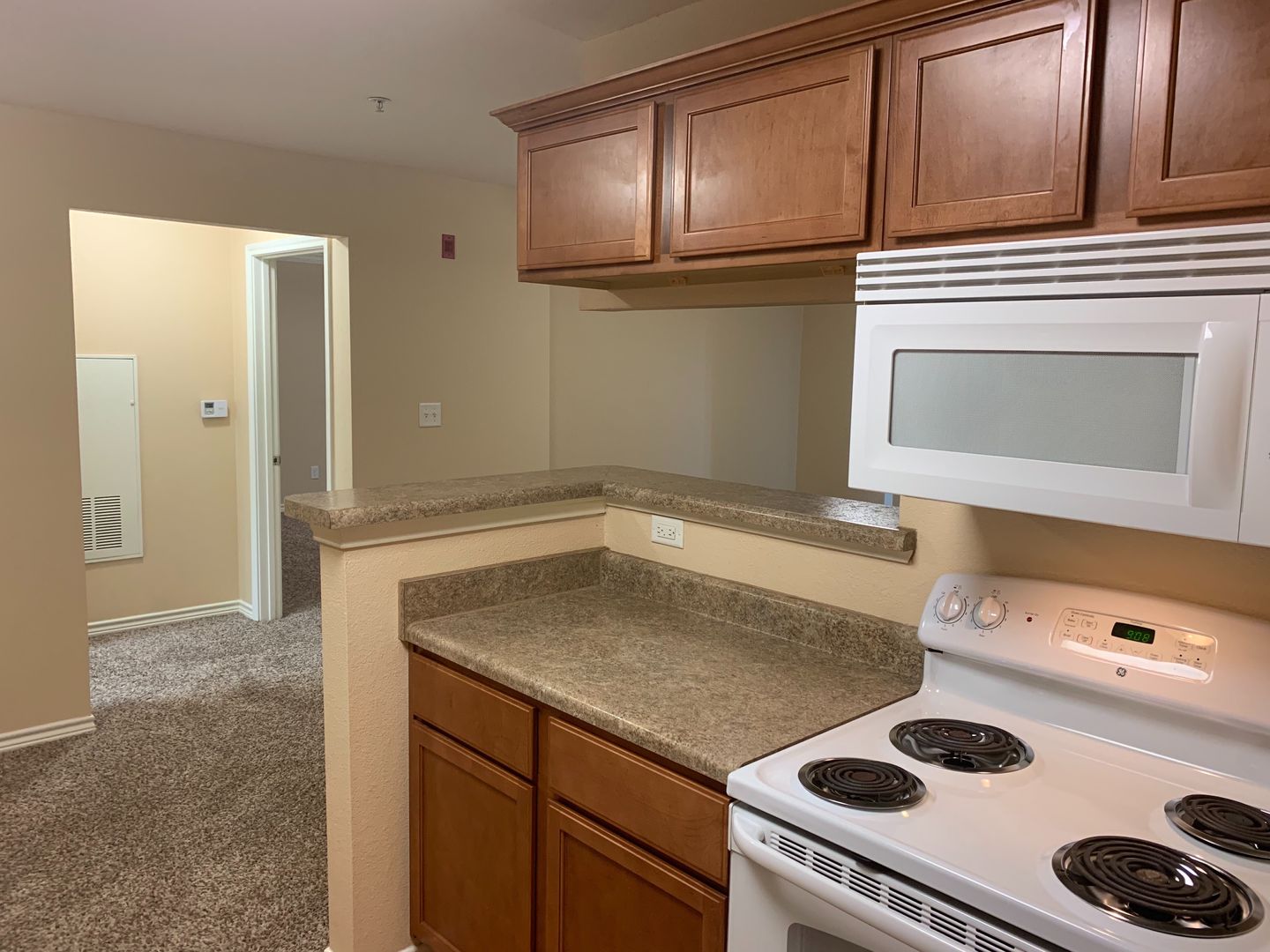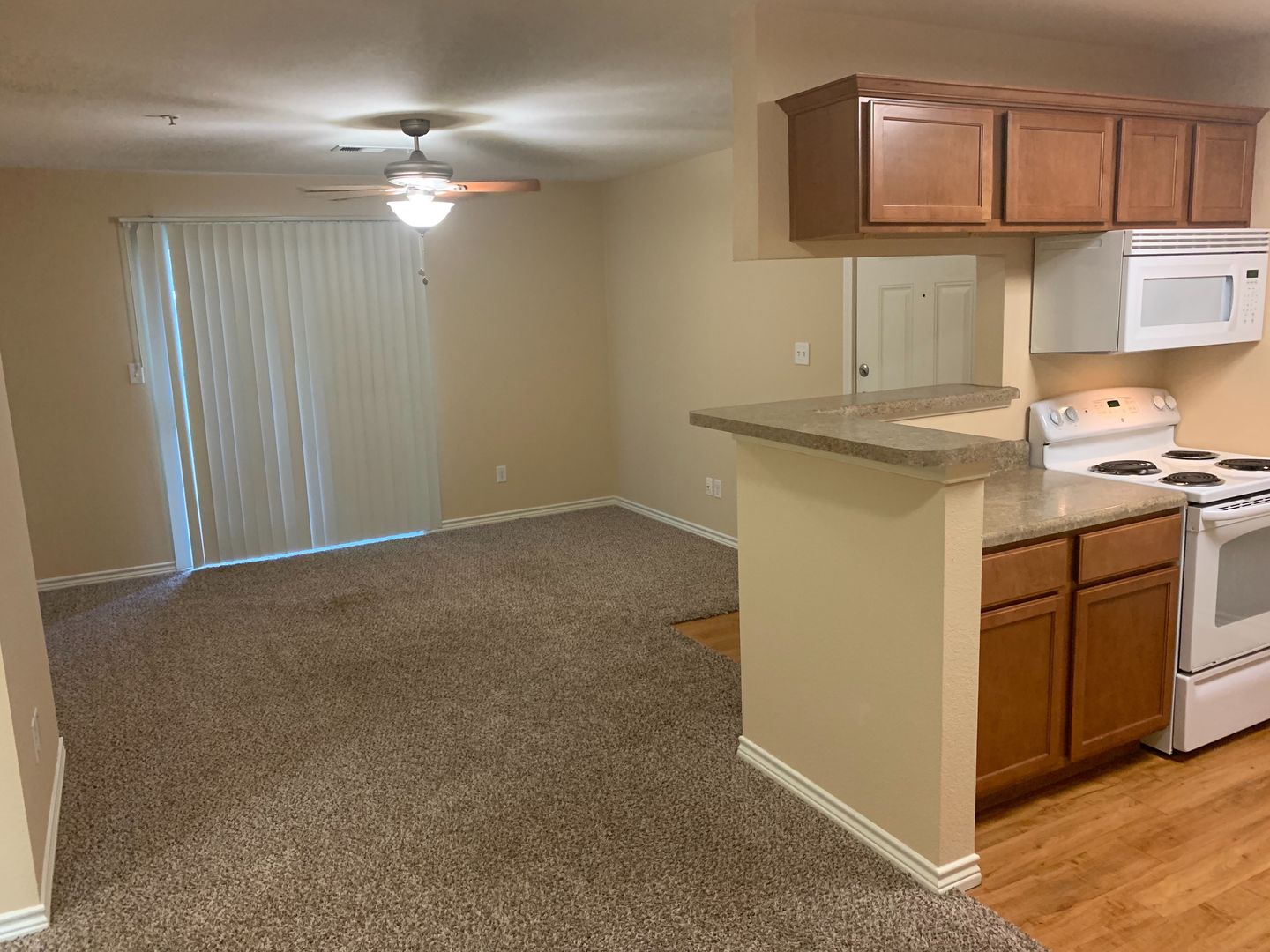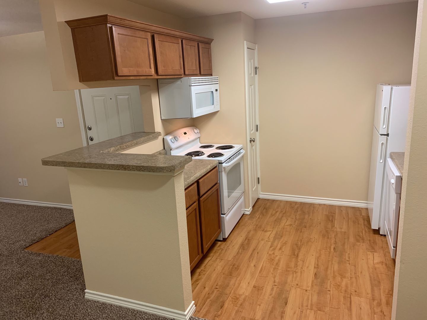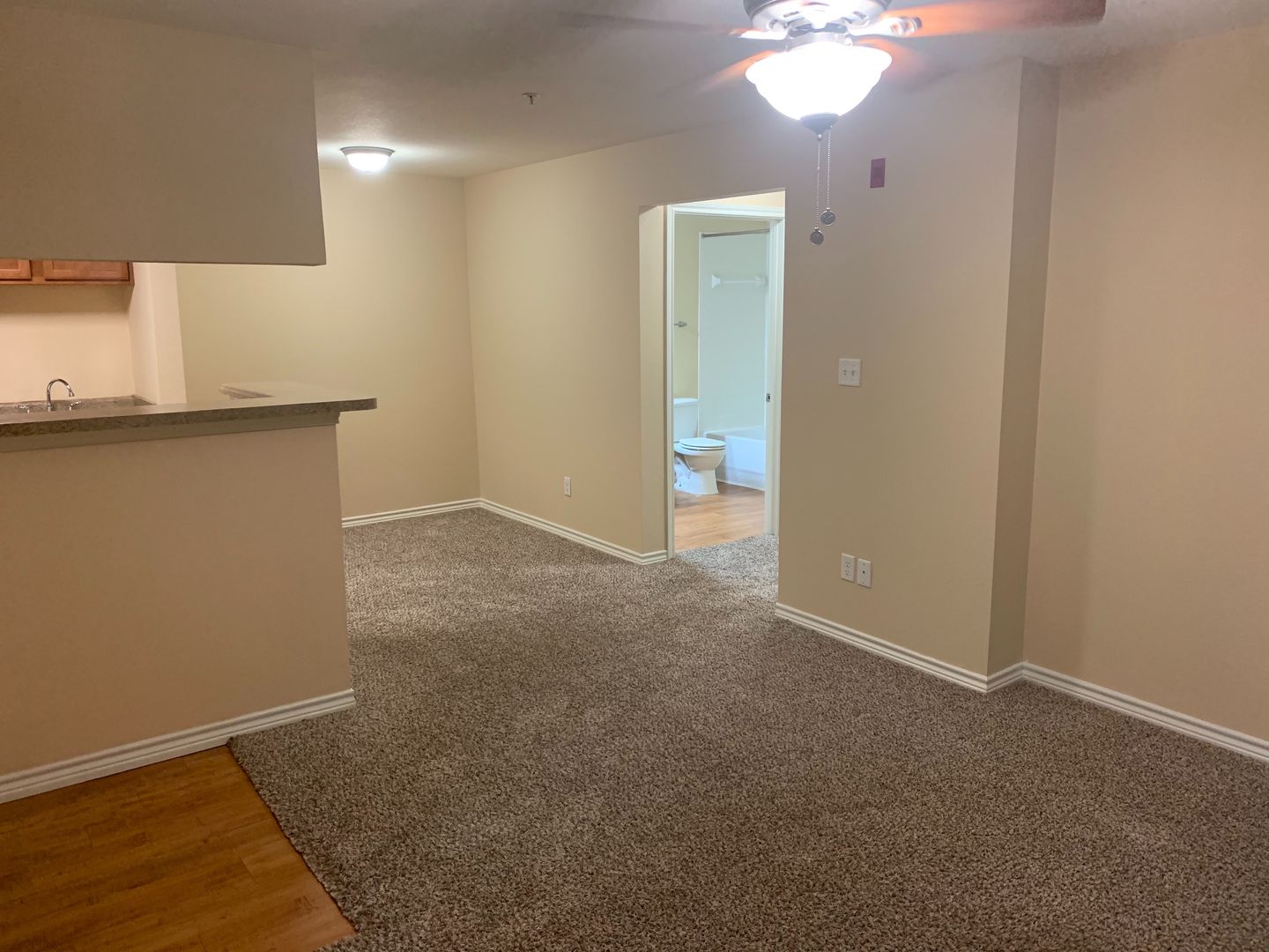Our two-bedroom, one-bath units are an amazing 897 sq. foot of coziness. The open floor plan is spacious and has a patio right off the living room so there is plenty of natural light. The bedrooms are tucked away down the hall to create some peace and quiet when needing to relax. A guest bath in the hall boasts a shower/tub combo and offers an extra-long vanity along with a nice-sized linen closet.