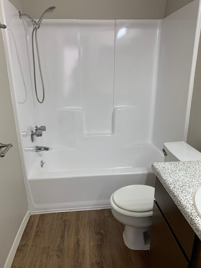 Option two is our spacious 703 sq. foot 1-bedroom, 1-bath floor plan. The bedroom is large enough to easily accommodate a King-size bedroom suite. The closet in this floor plan has generous space along with built-in shelving for shoes or storage. There is plenty of hanging room for all your clothing and winter jackets. The bathroom has a large vanity with a medicine cabinet. The shower/tub combo is perfect for relaxing after a long day at work, with your towel within reach from a spacious linen closet.