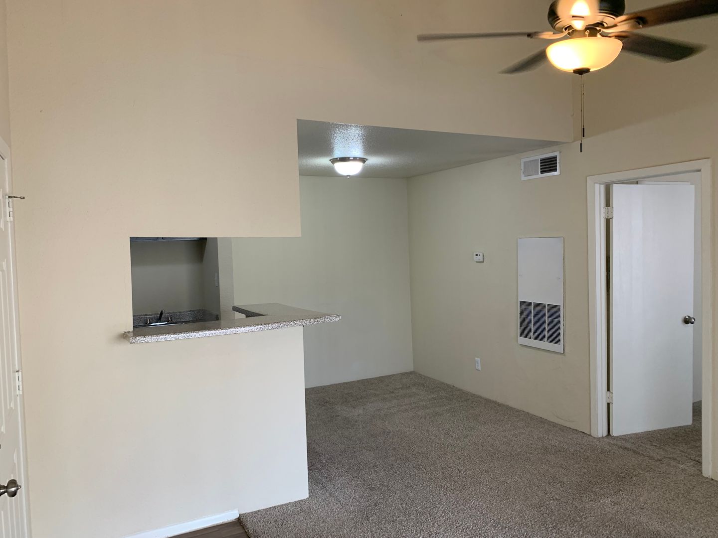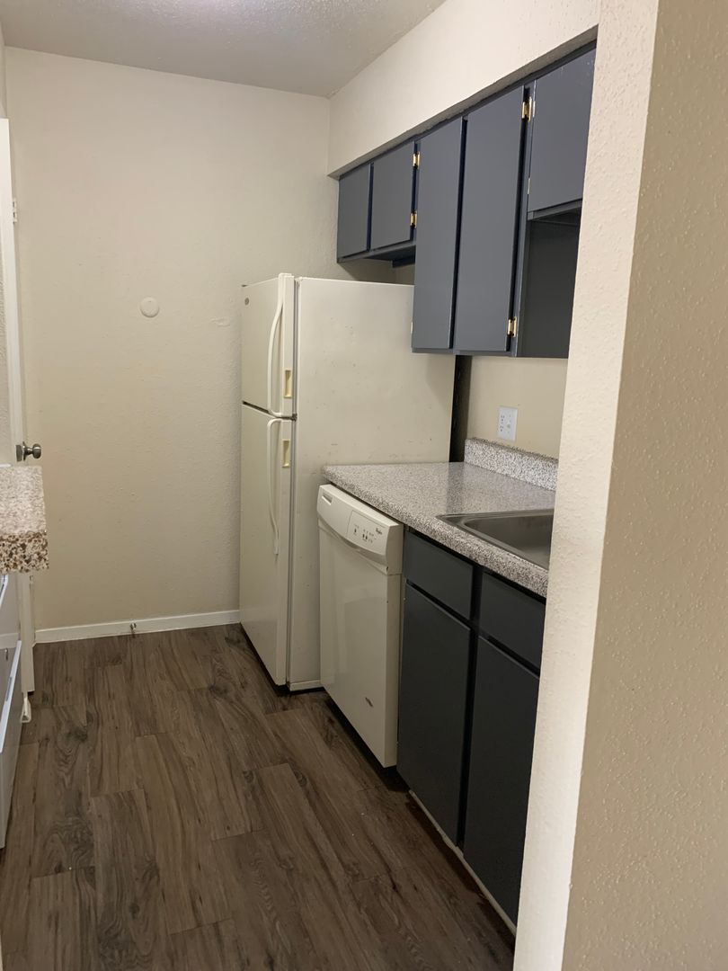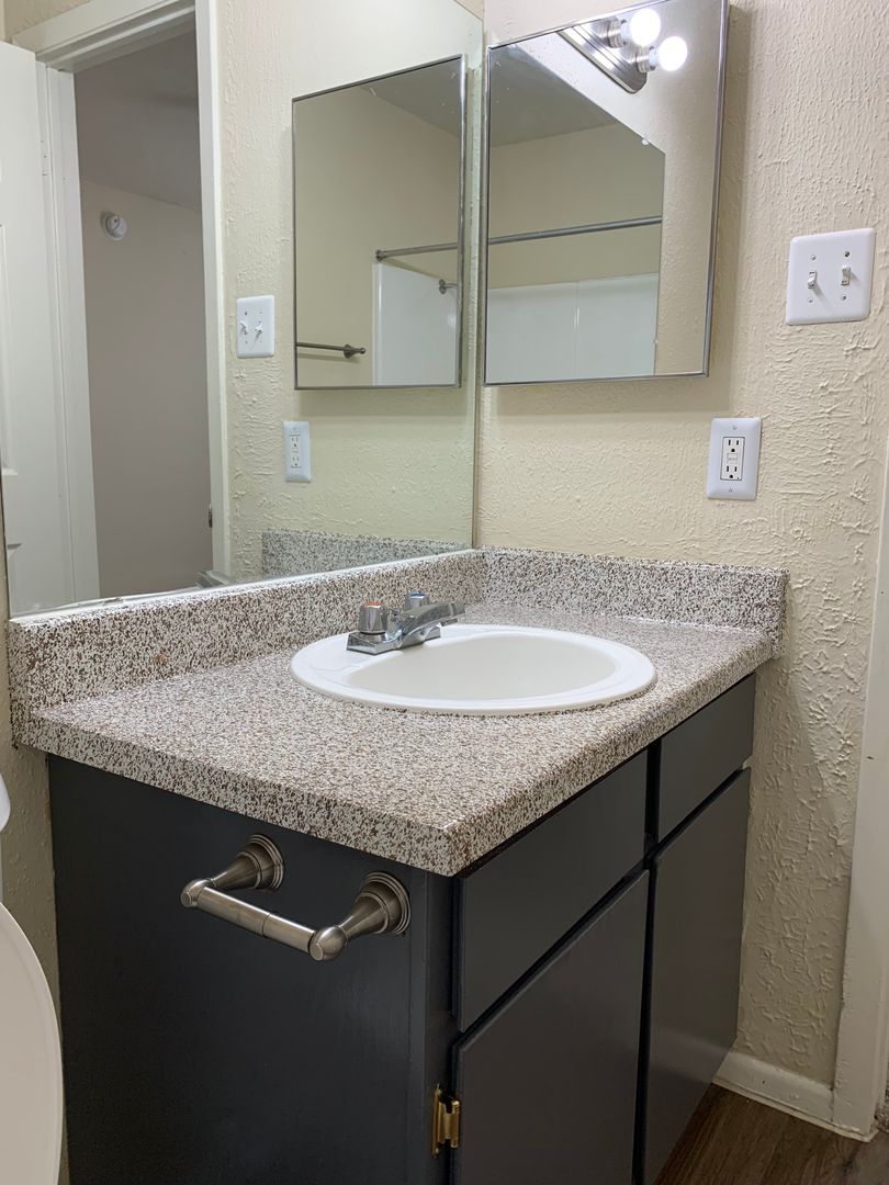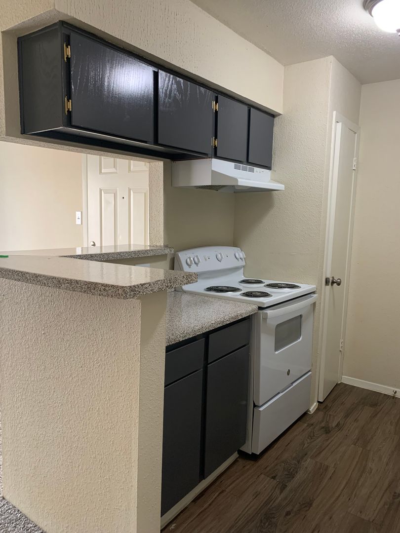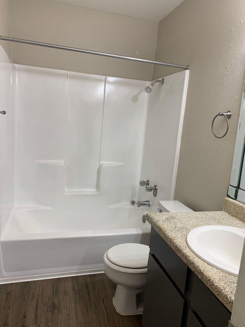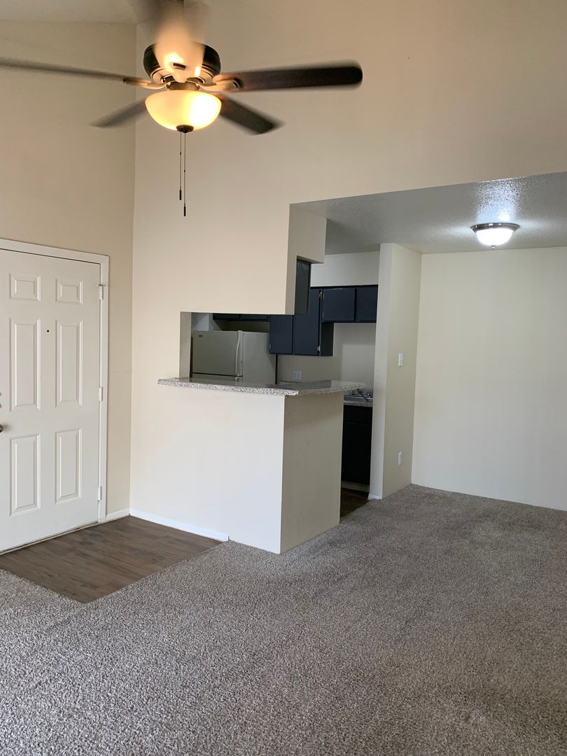 Our two-bedroom, one-bath units are an amazing 897 sq. foot of coziness. The open floor plan is spacious and has a patio right off the living room so there is plenty of natural light. The bedrooms are tucked away down the hall to create some peace and quiet when needing to relax. A guest bath in the hall boasts a shower/tub combo and offers an extra-long vanity along with a nice-sized linen closet.