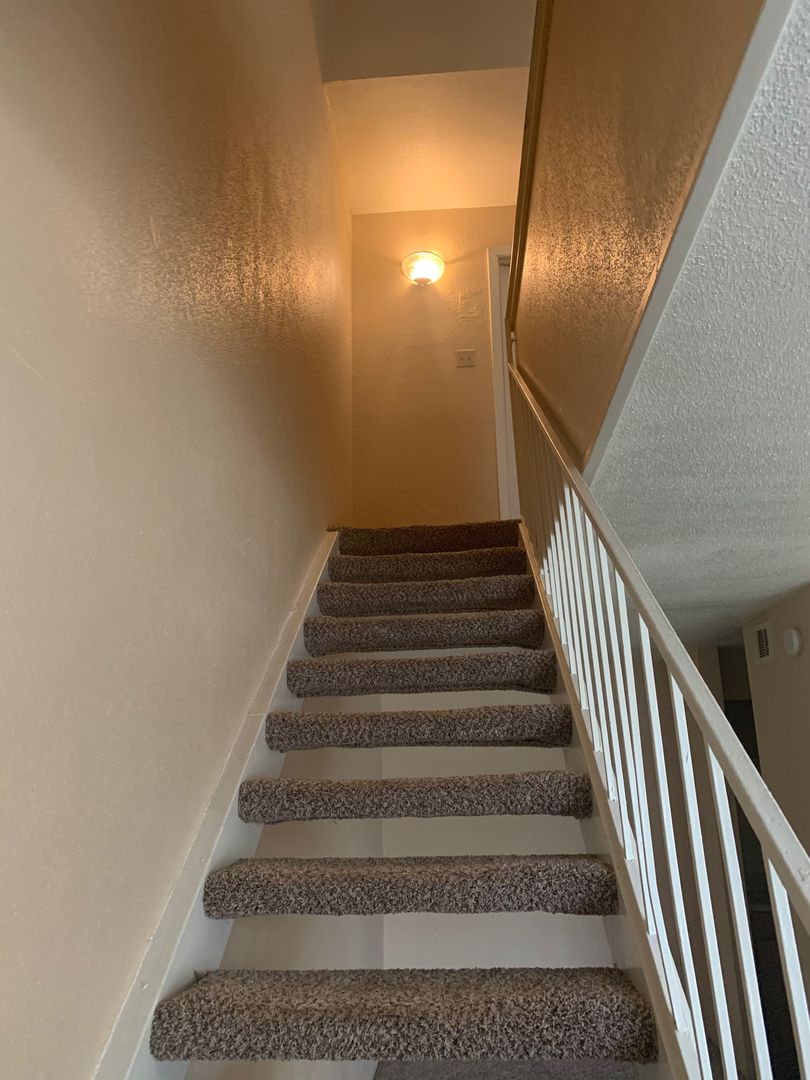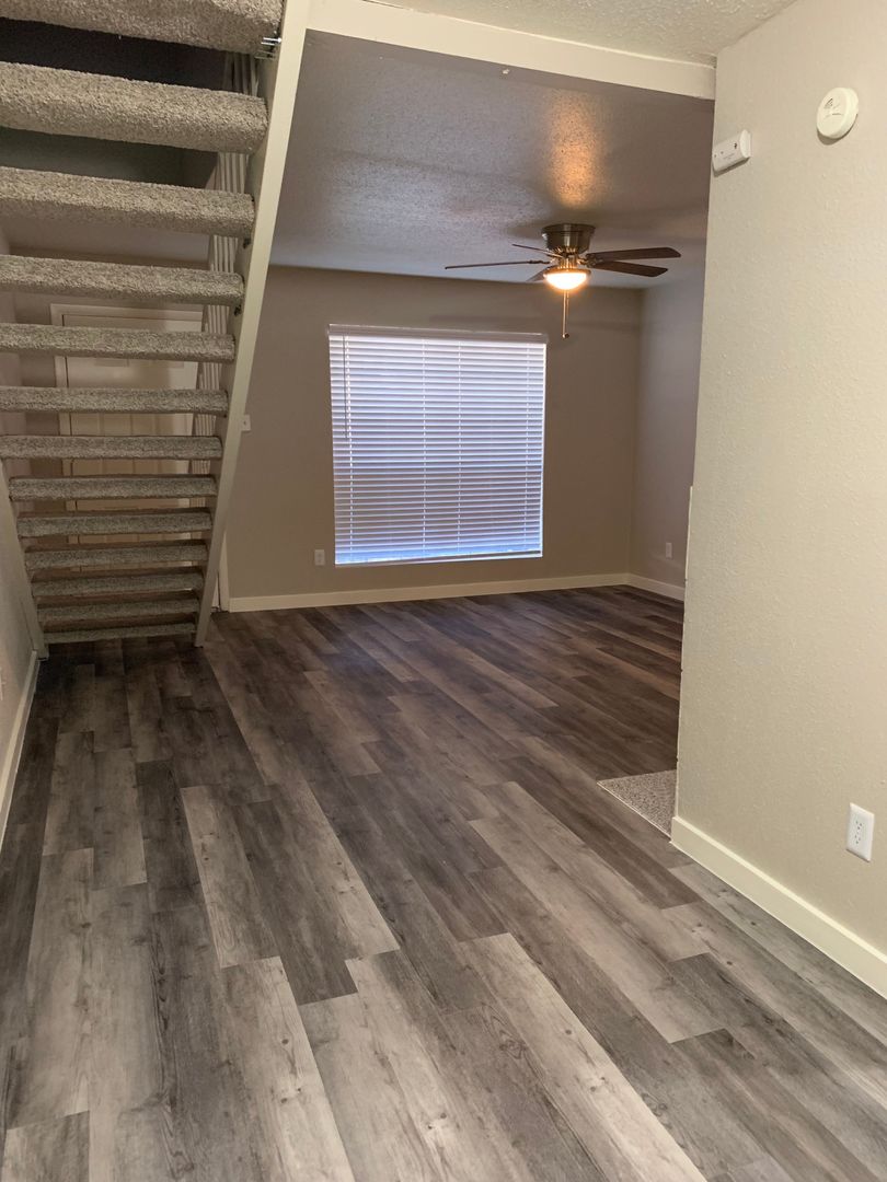 Last but not by far least is our 1-bedroom, 1-bath townhomes. These give you the feeling of a private home with 841 sq. foot of complete privacy. Our townhomes are open concept with the living room, dining room, and kitchen downstairs and the bedroom and 2 closets upstairs. The living room features a fireplace in the center to give many options to make this space your own. There is a large balcony to enjoy a warm cup of coffee or listen to the birds sing in the evening. This floor plan allows you the freedom to not worry about neighbors above or under you; it is nice and quiet at all times.