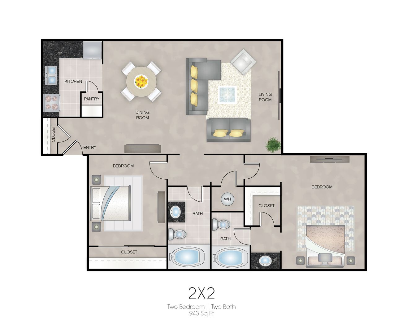 This inviting two-bedroom, two-bathroom floor plan spans 943 sq. ft. and features a bright, open layout designed for comfort and style. With a private patio to extend your living space outdoors, you’ll have the perfect spot to relax or entertain. A spacious design at a great value—without compromising the essentials!