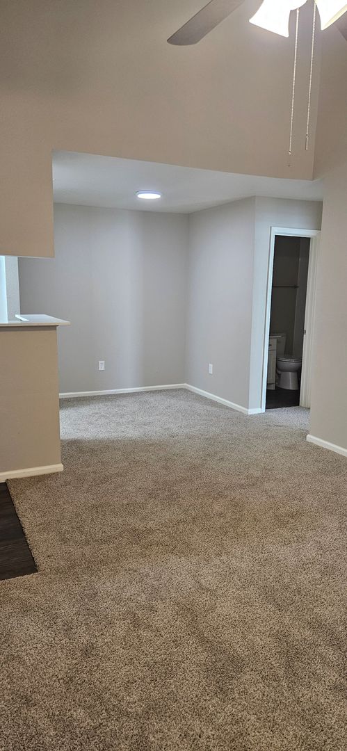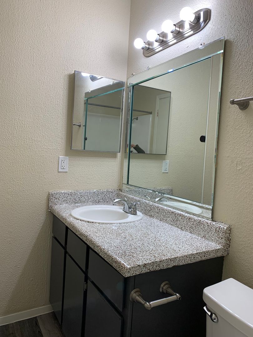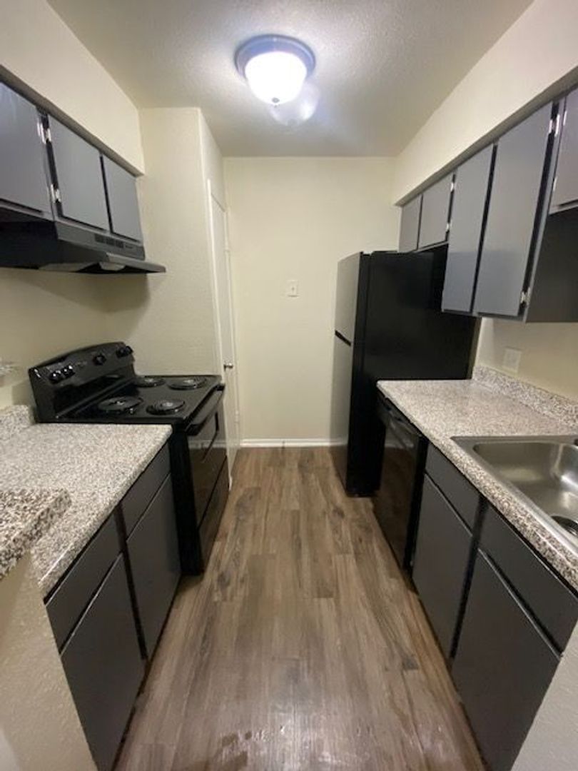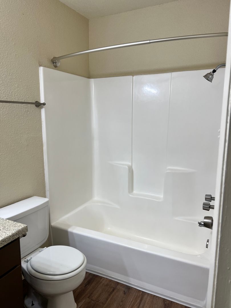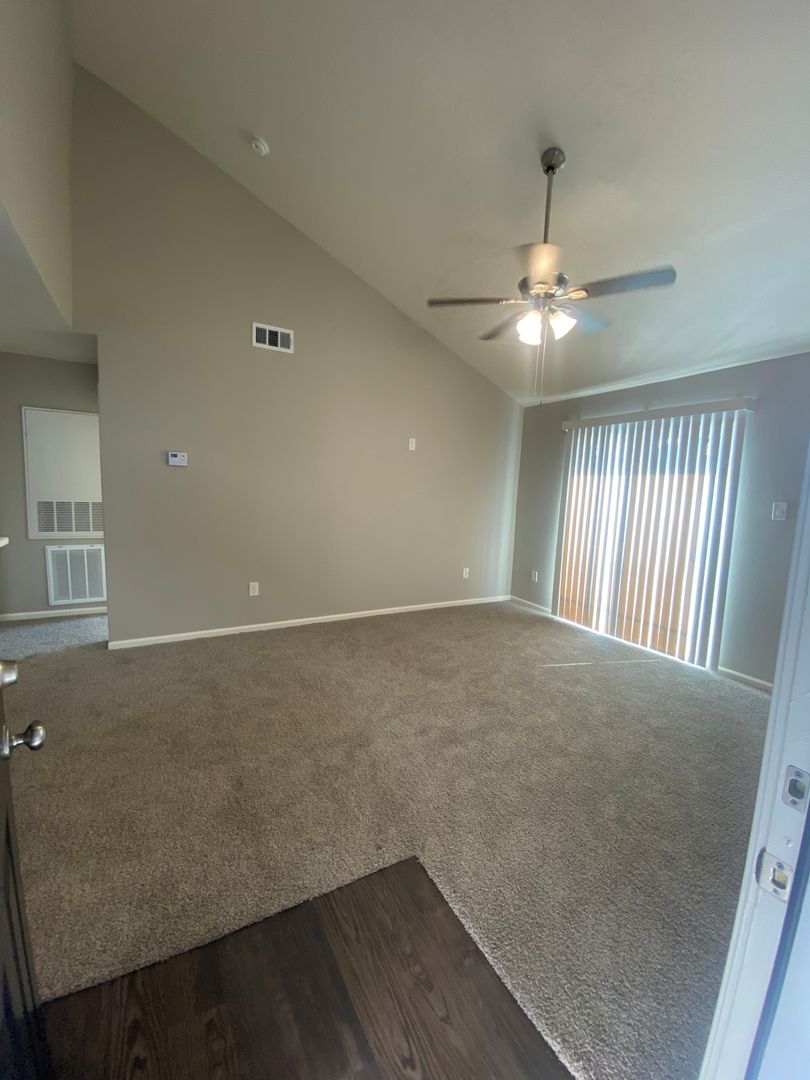 Our two-bedroom, one-bath units are an amazing 897 sq. foot of coziness. The open floor plan is spacious and has a patio right off the living room so there is plenty of natural light. The bedrooms are tucked away down the hall to create some peace and quiet when needing to relax. A guest bath in the hall boasts a shower/tub combo and offers an extra-long vanity along with a nice-sized linen closet.