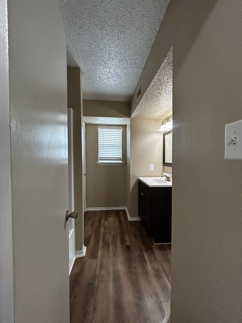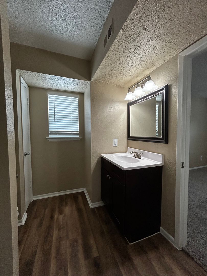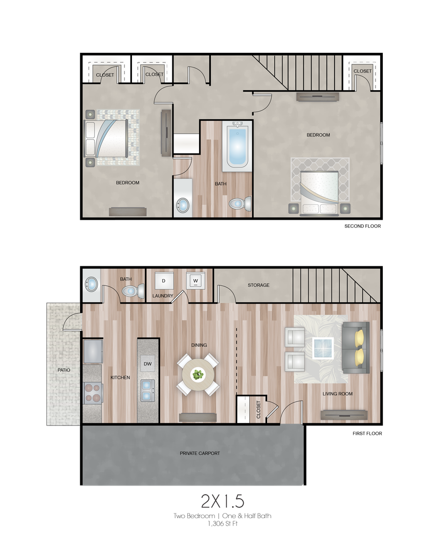 All our floor plans are 2 bedroom 1.5 bath townhome, 1306 sq. ft or 2 bedroom 2.5 townhome, 1376 sq ft and feature two enormous bedrooms for any size bedroom furniture. Both bedrooms stay cool with beautiful ceiling fans and a window in each bedroom to let in plenty of natural light. Each townhome comes with a ton of closet storage throughout the unit. Hanging space is plentiful and each closet also features a top shelf for extra storage. The 1.5 bath townhome comes with one master bedroom that has an entrance from the bedroom to the bath with an additional hallway entrance for guests. Our 2.5 townhome has both bedrooms upstairs as master bedrooms with the bathroom connected to each room