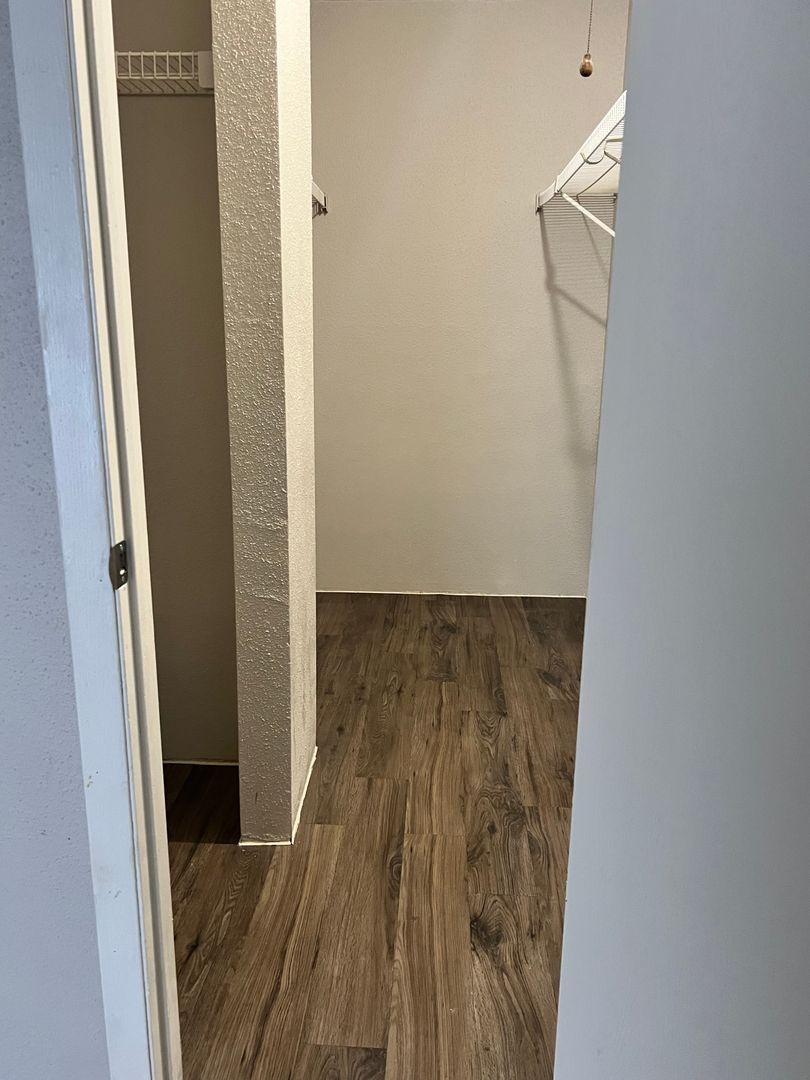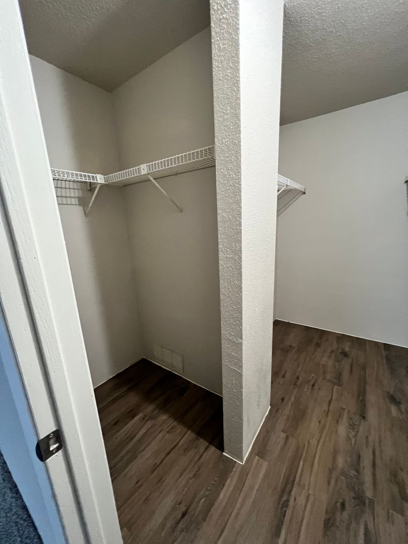 Option two is our spacious 703 sq. foot 1-bedroom, 1-bath floor plan. The bedroom is large enough to easily accommodate a King-size bedroom suite. The closet in this floor plan has generous space along with built-in shelving for shoes or storage. There is plenty of hanging room for all your clothing and winter jackets. The bathroom has a large vanity with a medicine cabinet. The shower/tub combo is perfect for relaxing after a long day at work, with your towel within reach from a spacious linen closet.