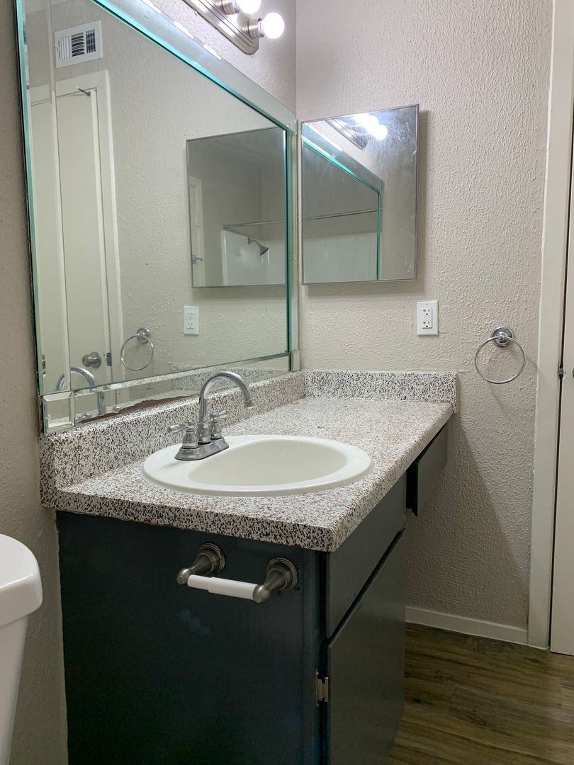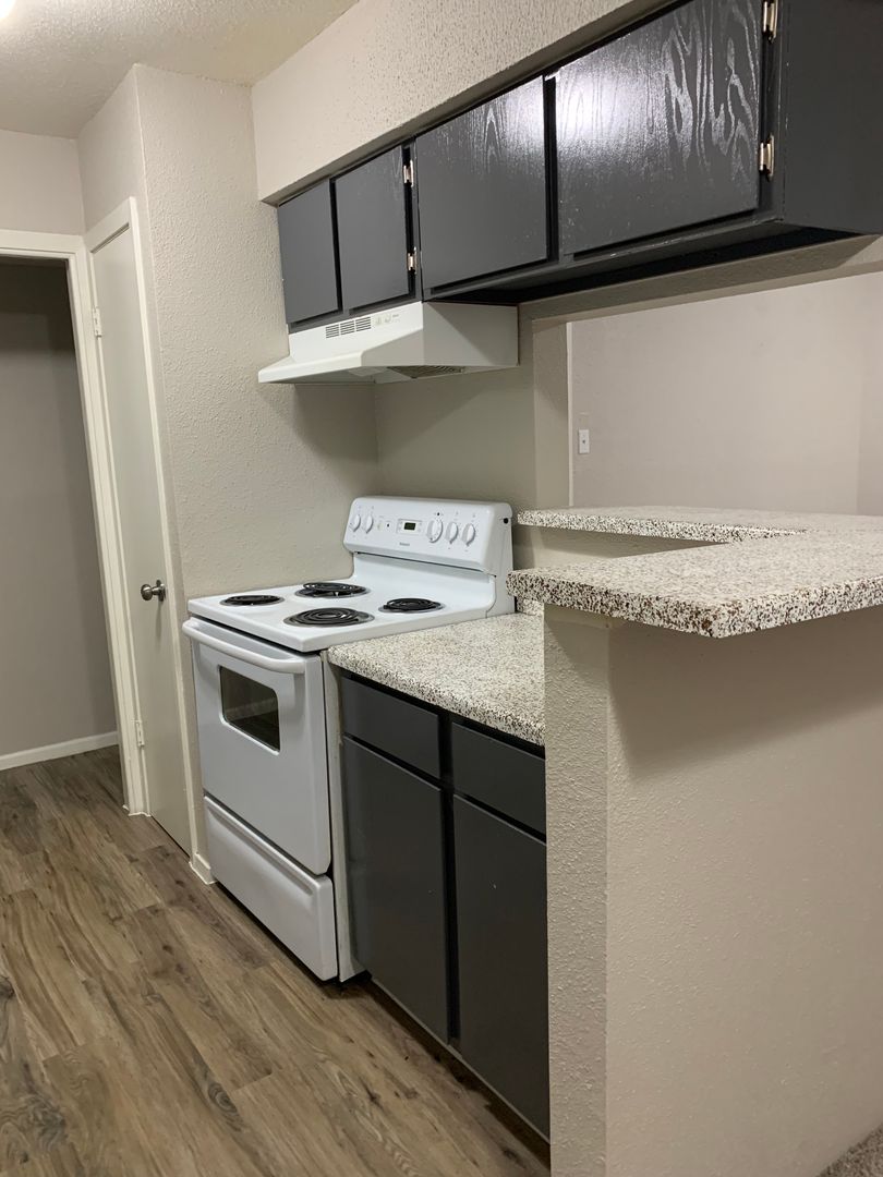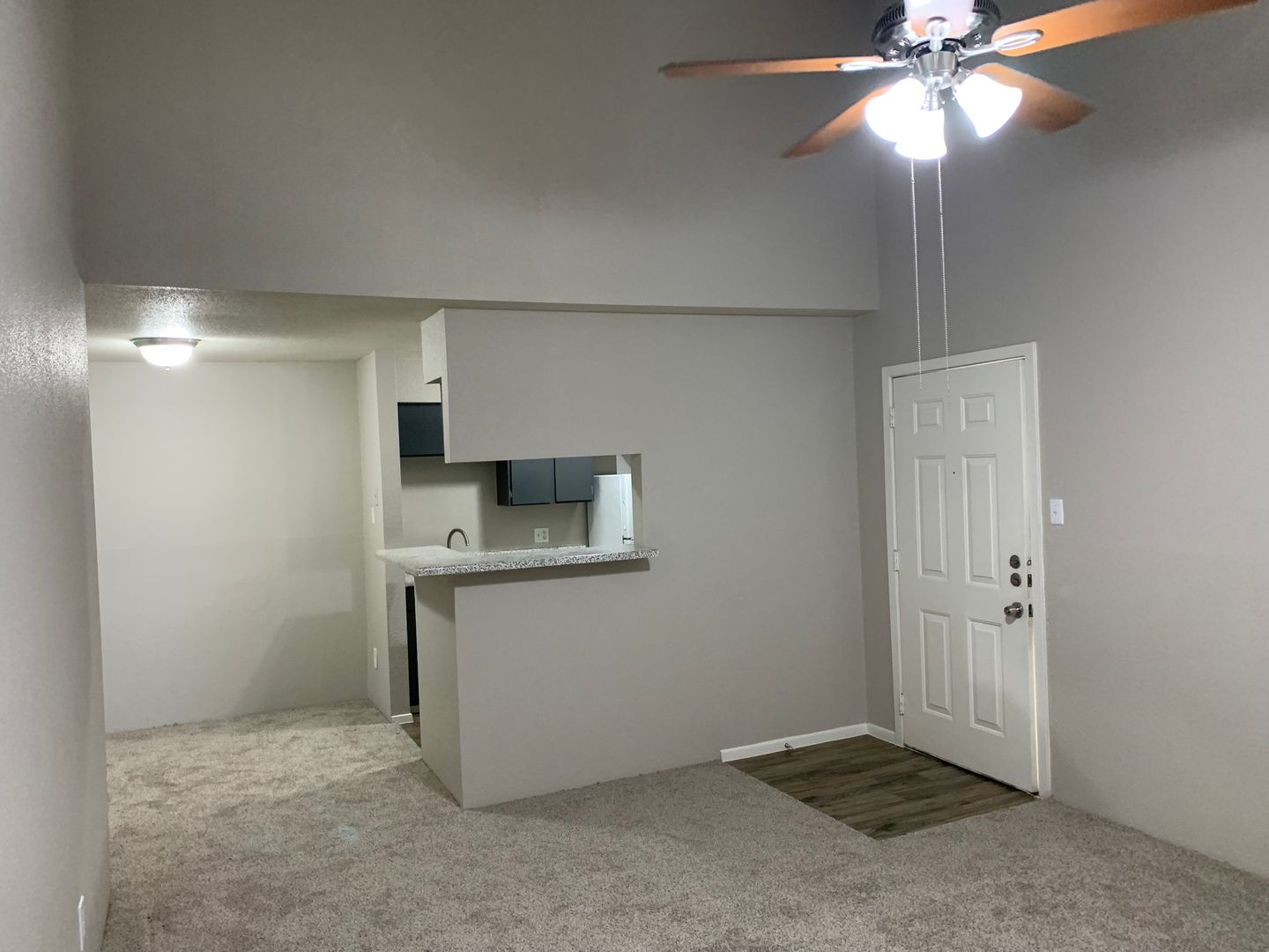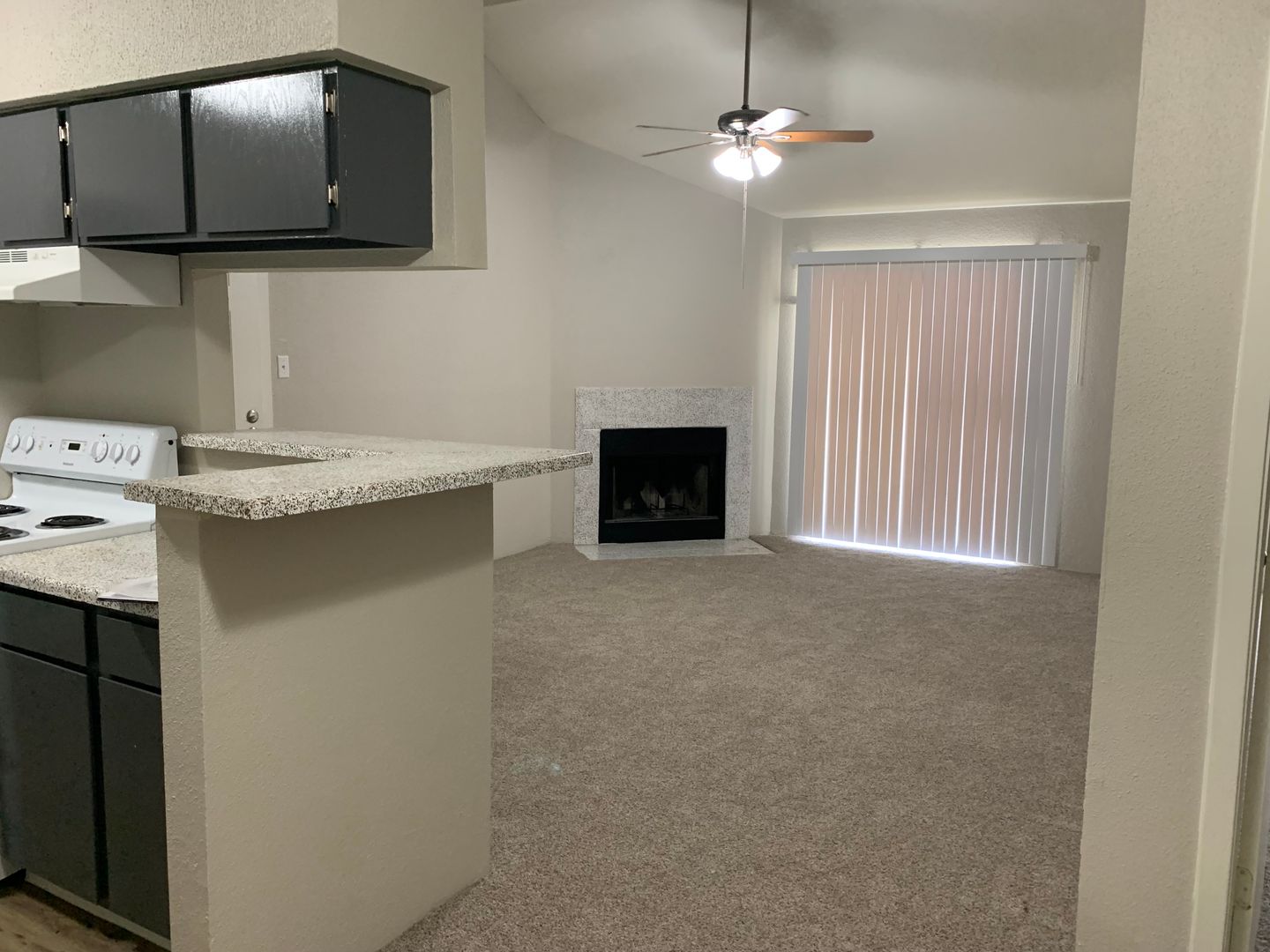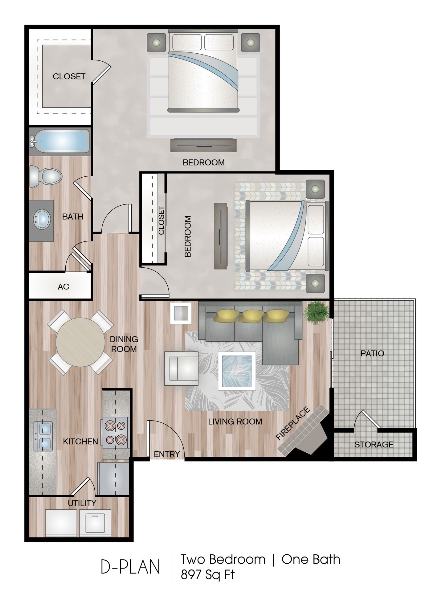 Our two-bedroom, one-bath units are an amazing 897 sq. foot of coziness. The open floor plan is spacious and has a patio right off the living room so there is plenty of natural light. The bedrooms are tucked away down the hall to create some peace and quiet when needing to relax. A guest bath in the hall boasts a shower/tub combo and offers an extra-long vanity along with a nice-sized linen closet.