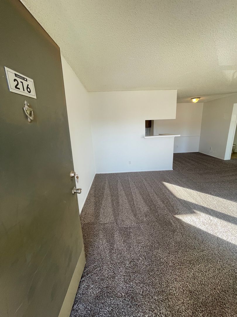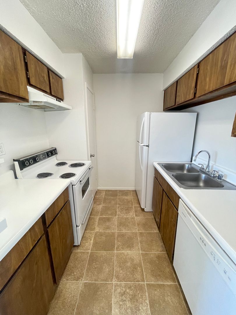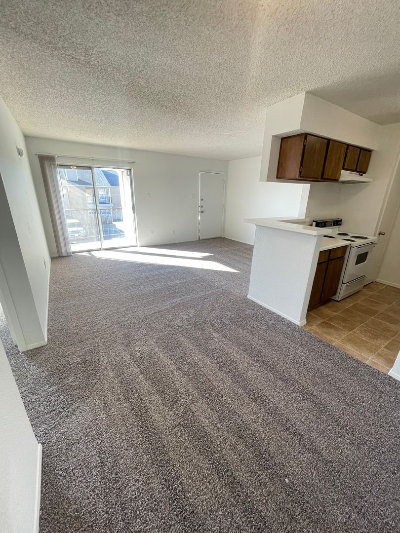 The entry to each home allows a full view of the living room and dining room. You can also sneak a peek into the galley kitchen through the open bar area! The patio or balcony next to the front door offers plentiful natural sunlight and helps to present a bright and uplifting living space. Select floor plans have a patio or balcony that will feature a storage closet for all your extras! The expansive living room is perfect for entertaining or relaxing and features abundant wall space to hang photos, posters and decor to create the home of your dreams. The living room seamlessly blends into the corner dining area and this nook is the perfect size for either a four-seat or six-seat dining table. Don't have a dining room table? No problem! This space is perfect for a gaming station or a homework/work bench. The long kitchen bar looks amazing with barstools or pub chairs tucked underneath and offers plenty of room to "eat on the go"! The kitchen features plenty of storage so all your cooking essentials can be neatly organized. All appliances are included in the kitchens except the microwave...don't forget to bring your own. Cook while you watch TV, entertain friends or curl up on your couch...the options in this living/dining/kitchen space are endless!