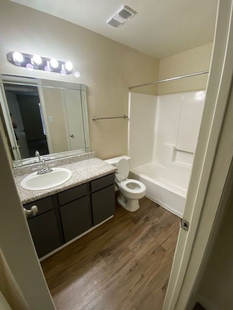 Our two-bedroom, one-bath units are an amazing 897 sq. foot of coziness. The open floor plan is spacious and has a patio right off the living room so there is plenty of natural light. The bedrooms are tucked away down the hall to create some peace and quiet when needing to relax. A guest bath in the hall boasts a shower/tub combo and offers an extra-long vanity along with a nice-sized linen closet.