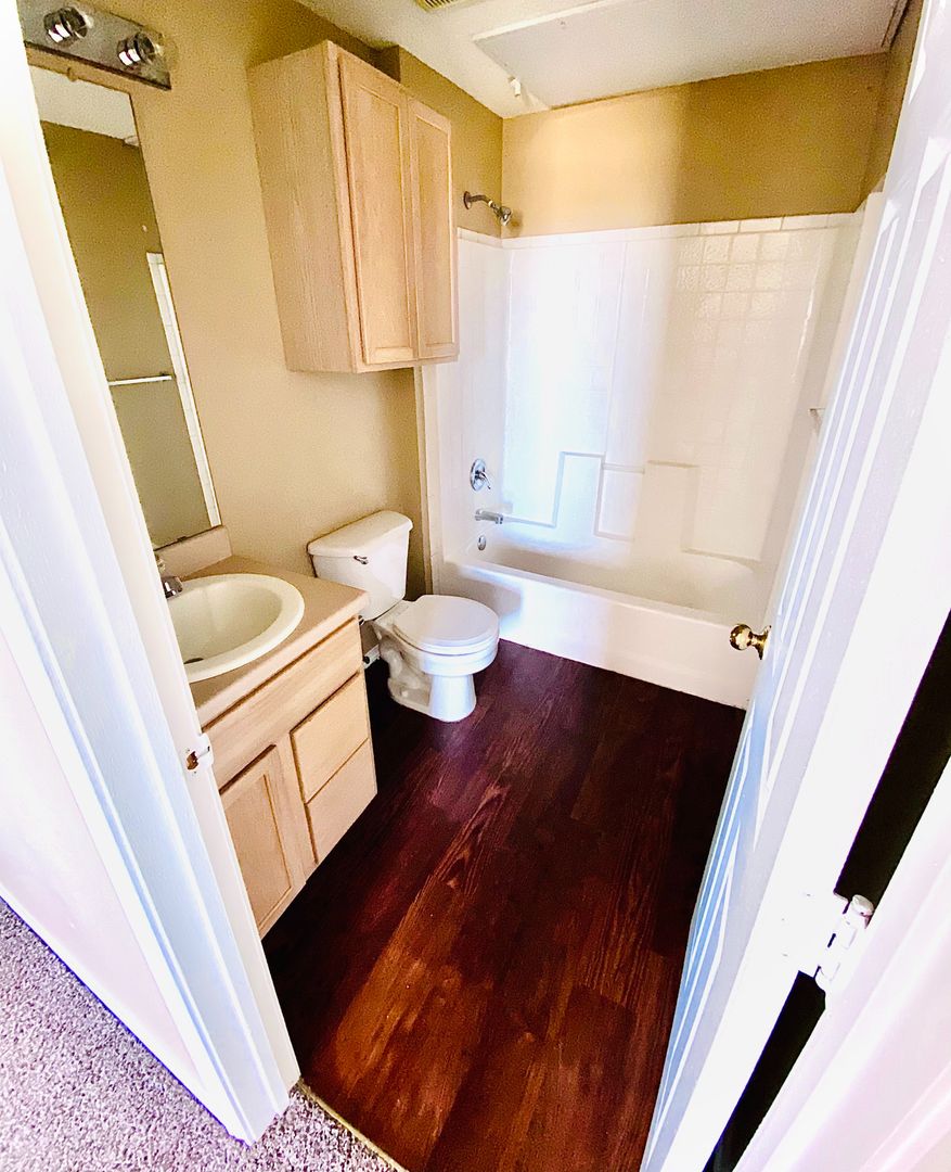 The bedroom in each home is kept cool and bright with the help of another large window and ceiling fan. The huge closet and private bathroom are located in each bedroom. Hanging space is plentiful and each closet also features a top shelf for extra storage. The bathroom is the perfect size with a shower/tub combo so a relaxing soak or a quick rinse are both options after a long day! The cabinet storage under the bathroom vanity or the extra storage cabinet on the wall are designated spaces for bath towels or linens.