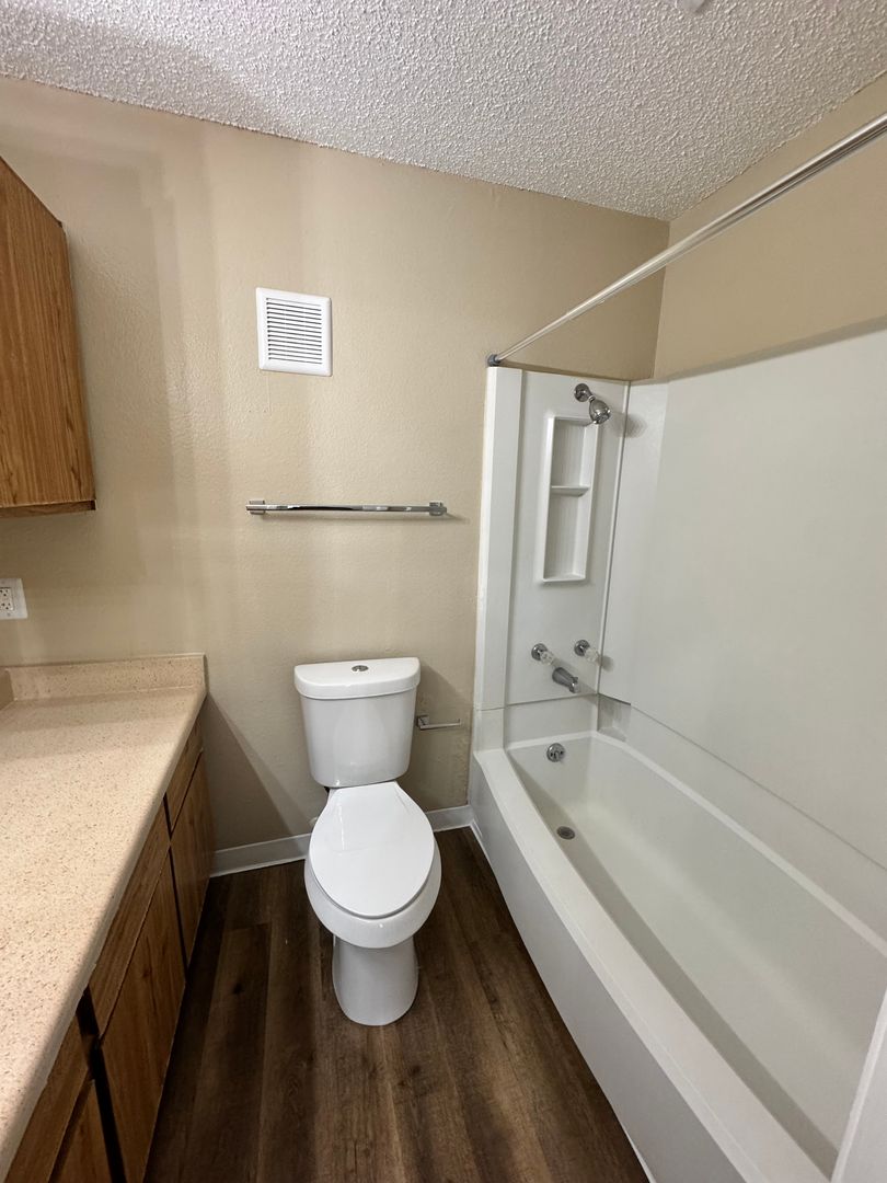 Our one bedroom with 615sq ft of living area comes with a gourmet type kitchen, equipped with either white or black appliances (microwave not included) and plenty of cabinet space to store all your cooking essentials that flows into your dining area; large enough to fit a dining room table. Your living room is spacious that may have a wood burning fireplace with a patio door that leads either to a private patio, or open patio with a storage closet large enough to hold a full-size washer/dryer. The bedroom will stay cool with beautiful ceiling fans and a window in each bedroom to let in plenty of natural light. You will find to your liking, a spacious walk-in closet. The bathroom will fit all your personal needs.