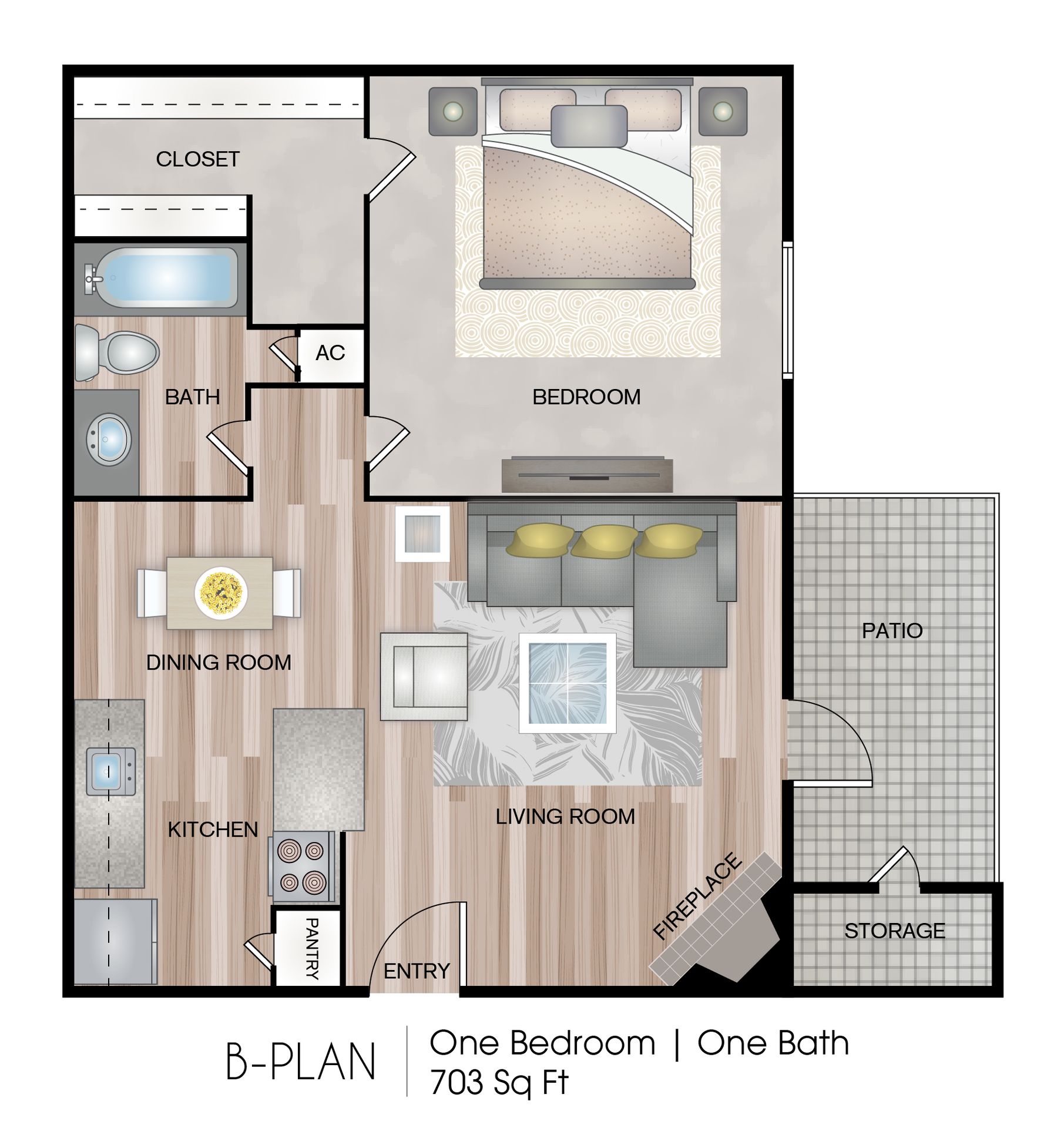 Option two is our spacious 703 sq. foot 1-bedroom, 1-bath floor plan. The bedroom is large enough to easily accommodate a King-size bedroom suite. The closet in this floor plan has generous space along with built-in shelving for shoes or storage. There is plenty of hanging room for all your clothing and winter jackets. The bathroom has a large vanity with a medicine cabinet. The shower/tub combo is perfect for relaxing after a long day at work, with your towel within reach from a spacious linen closet.