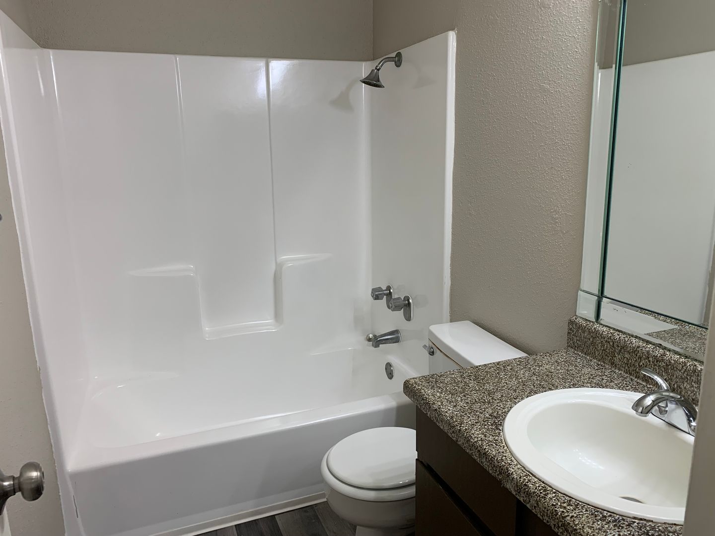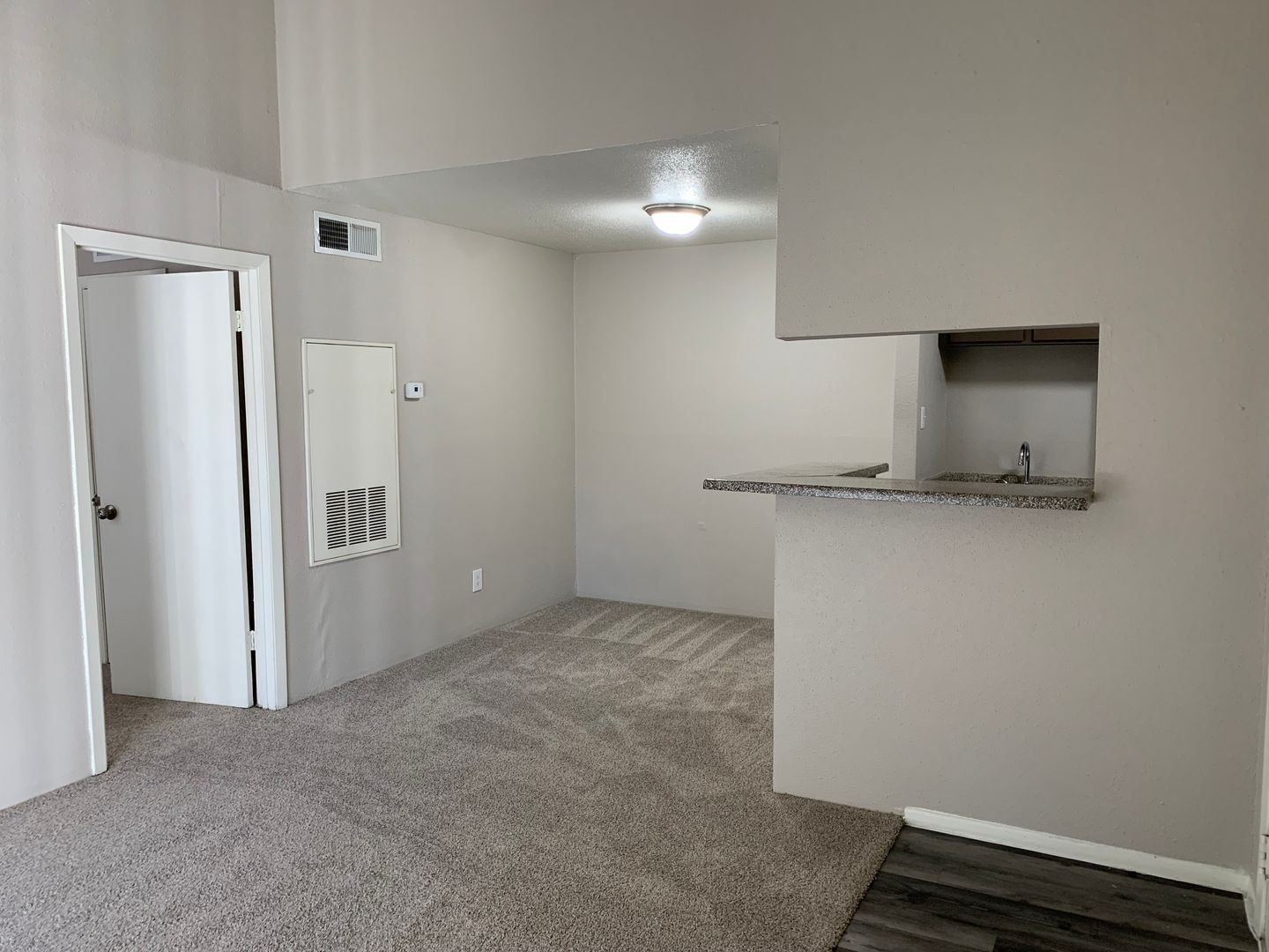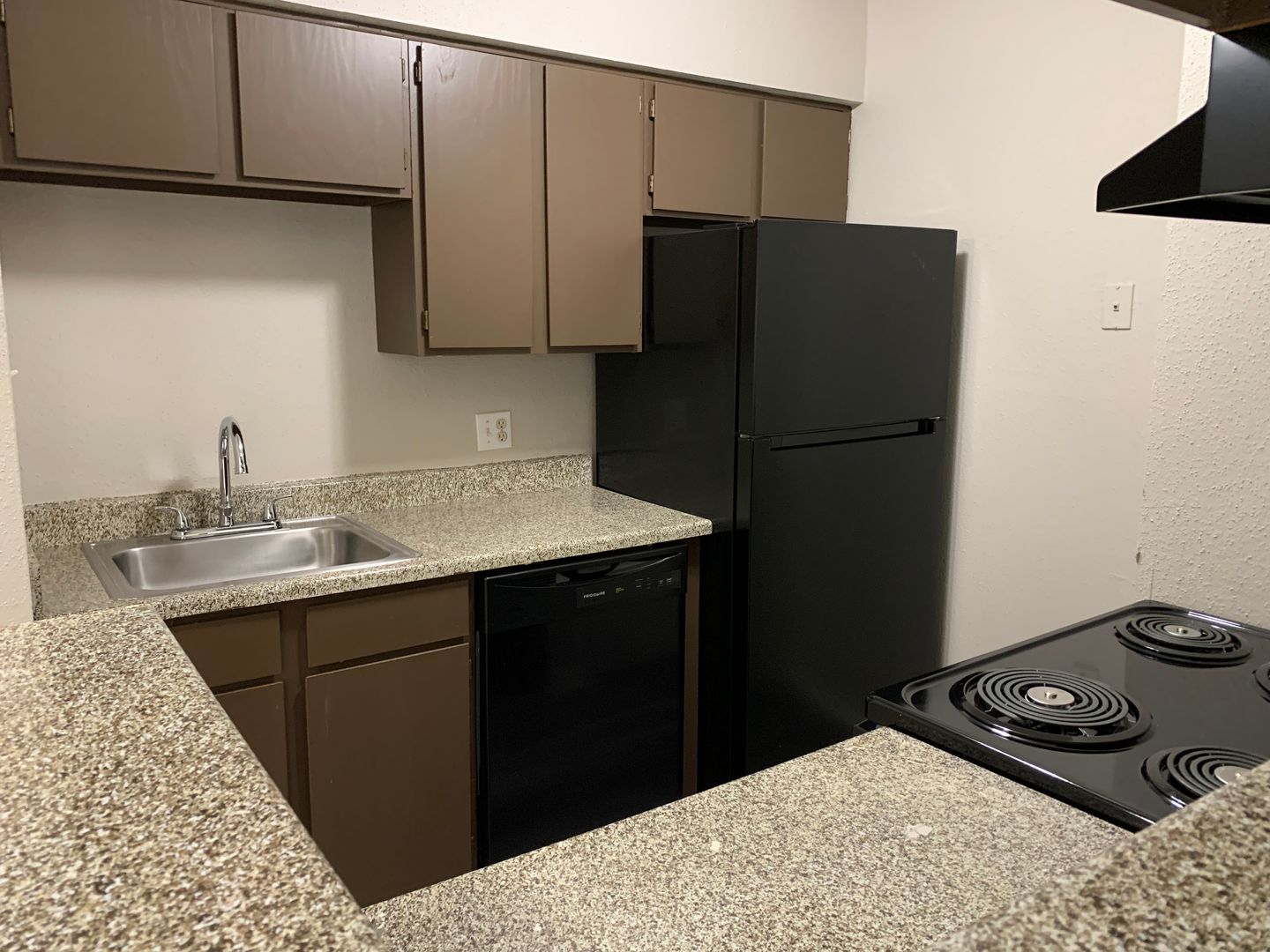 Our two-bedroom, one-bath units are an amazing 897 sq. foot of coziness. The open floor plan is spacious and has a patio right off the living room so there is plenty of natural light. The bedrooms are tucked away down the hall to create some peace and quiet when needing to relax. A guest bath in the hall boasts a shower/tub combo and offers an extra-long vanity along with a nice-sized linen closet.