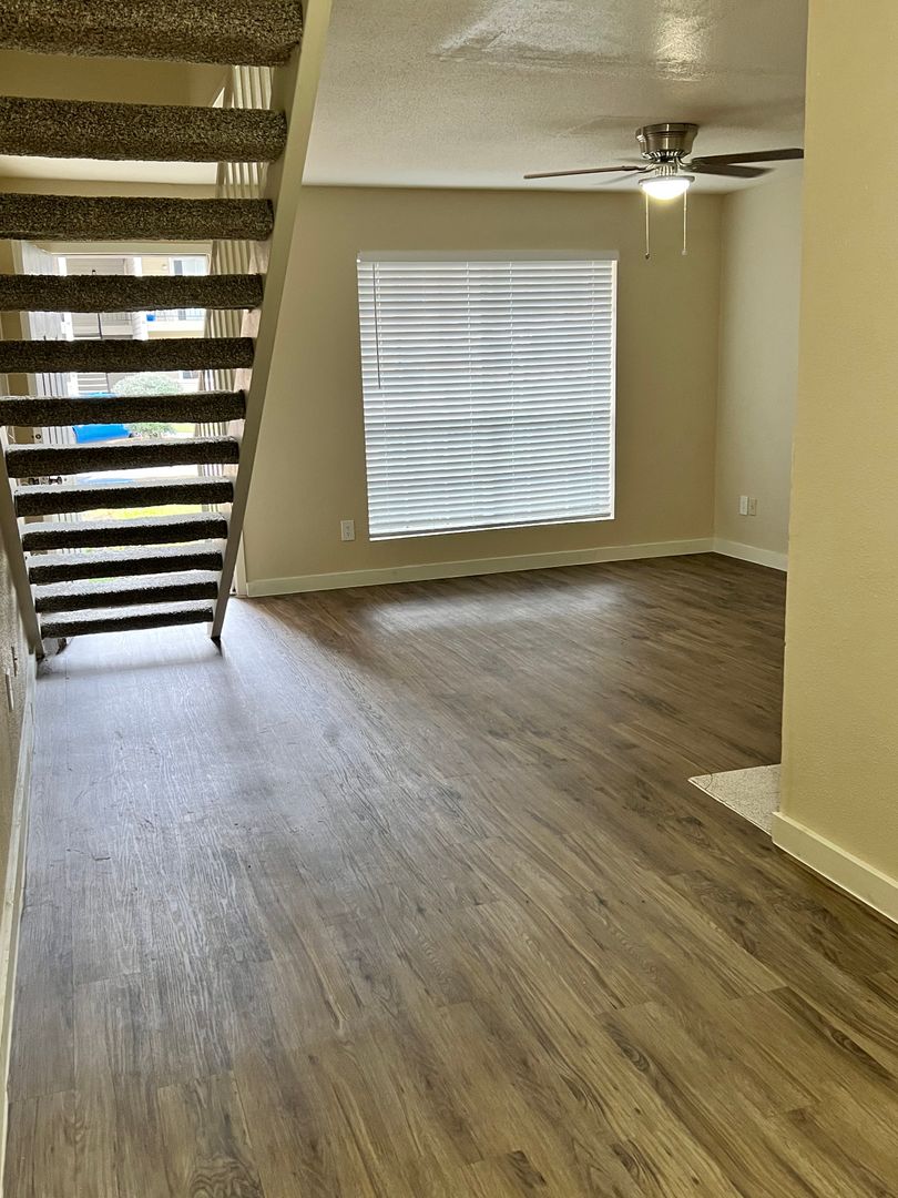 Last but not by far least is our 1-bedroom, 1-bath townhomes. These give you the feeling of a private home with 841 sq. foot of complete privacy. Our townhomes are open concept with the living room, dining room, and kitchen downstairs and the bedroom and 2 closets upstairs. The living room features a fireplace in the center to give many options to make this space your own. There is a large balcony to enjoy a warm cup of coffee or listen to the birds sing in the evening. This floor plan allows you the freedom to not worry about neighbors above or under you; it is nice and quiet at all times.