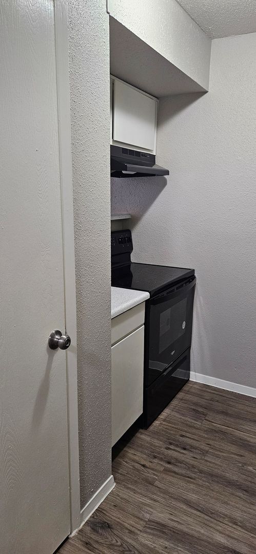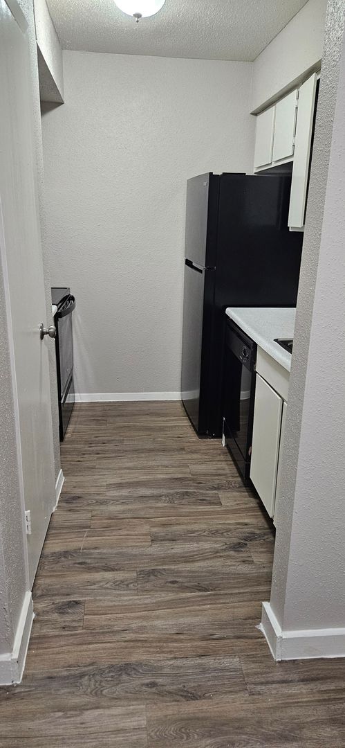 Choose from three different options in our 1-bedroom, 1-bath floor plans. The first is a cozy 543 sq. foot floor plan which has ceiling fans in both the living room and bedroom. The bedroom is spacious enough for a full-size bed with nightstands and a dresser. The large walk-in closet has plenty of hanging space and features a top shelf for extra storage.