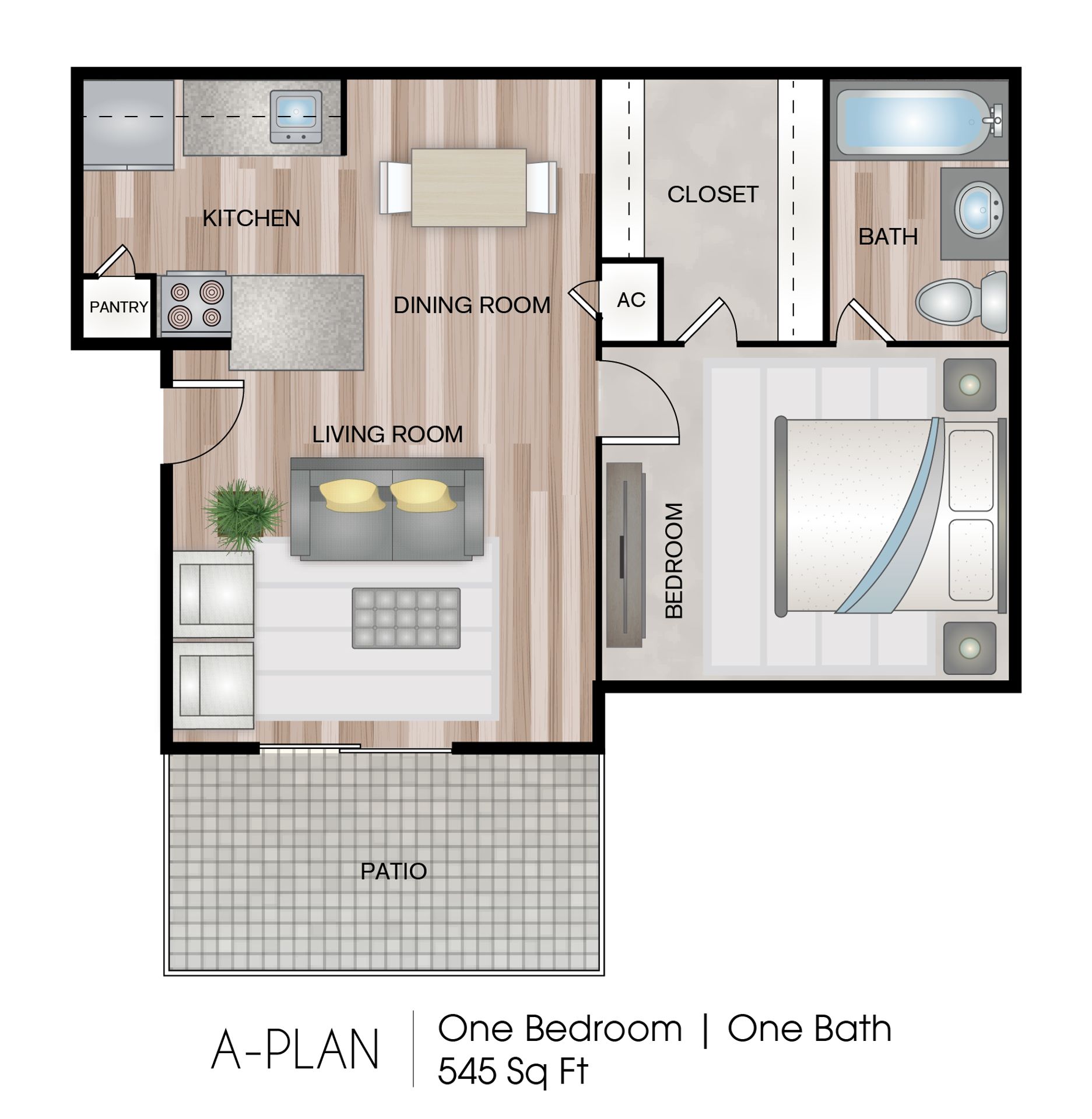 Choose from three different options in our 1-bedroom, 1-bath floor plans. The first is a cozy 543 sq. foot floor plan which has ceiling fans in both the living room and bedroom. The bedroom is spacious enough for a full-size bed with nightstands and a dresser. The large walk-in closet has plenty of hanging space and features a top shelf for extra storage.
