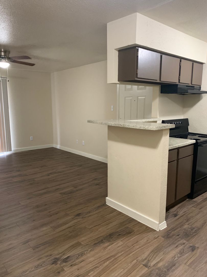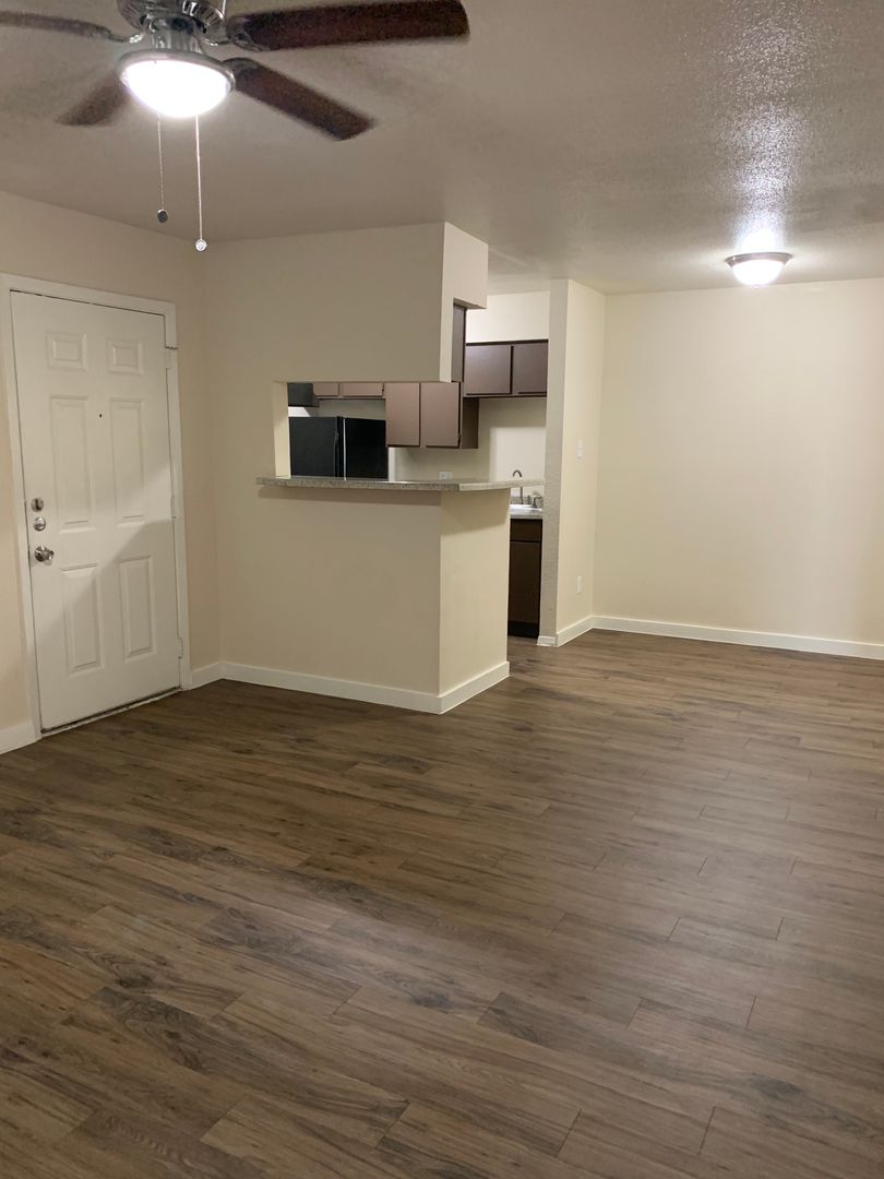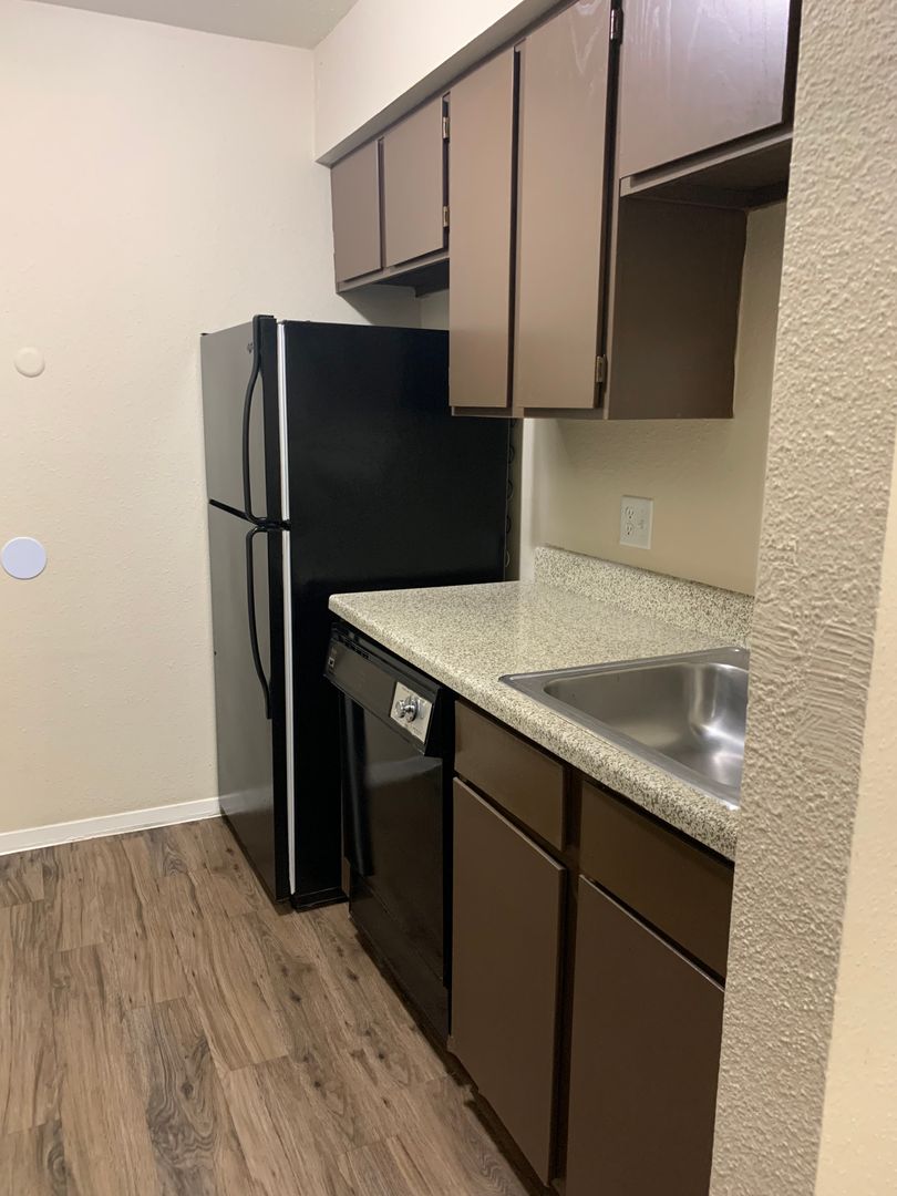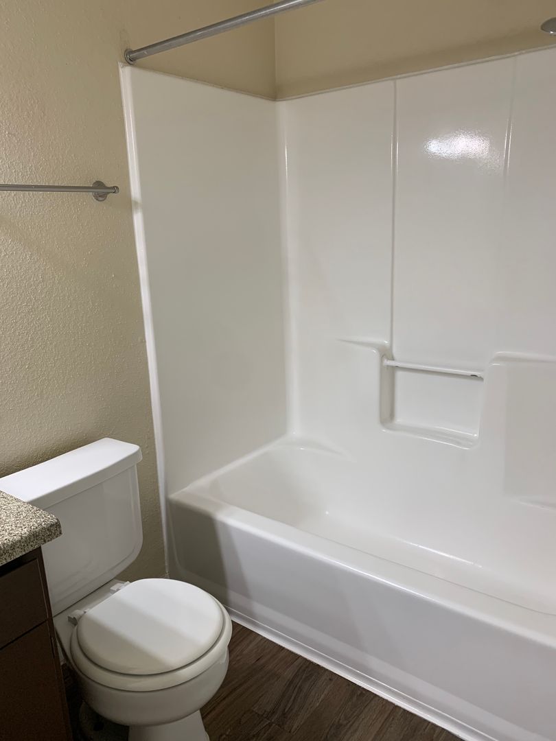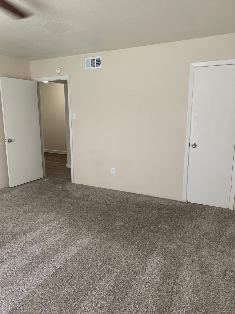Our two-bedroom, one-bath units are an amazing 897 sq. foot of coziness. The open floor plan is spacious and has a patio right off the living room so there is plenty of natural light. The bedrooms are tucked away down the hall to create some peace and quiet when needing to relax. A guest bath in the hall boasts a shower/tub combo and offers an extra-long vanity along with a nice-sized linen closet.