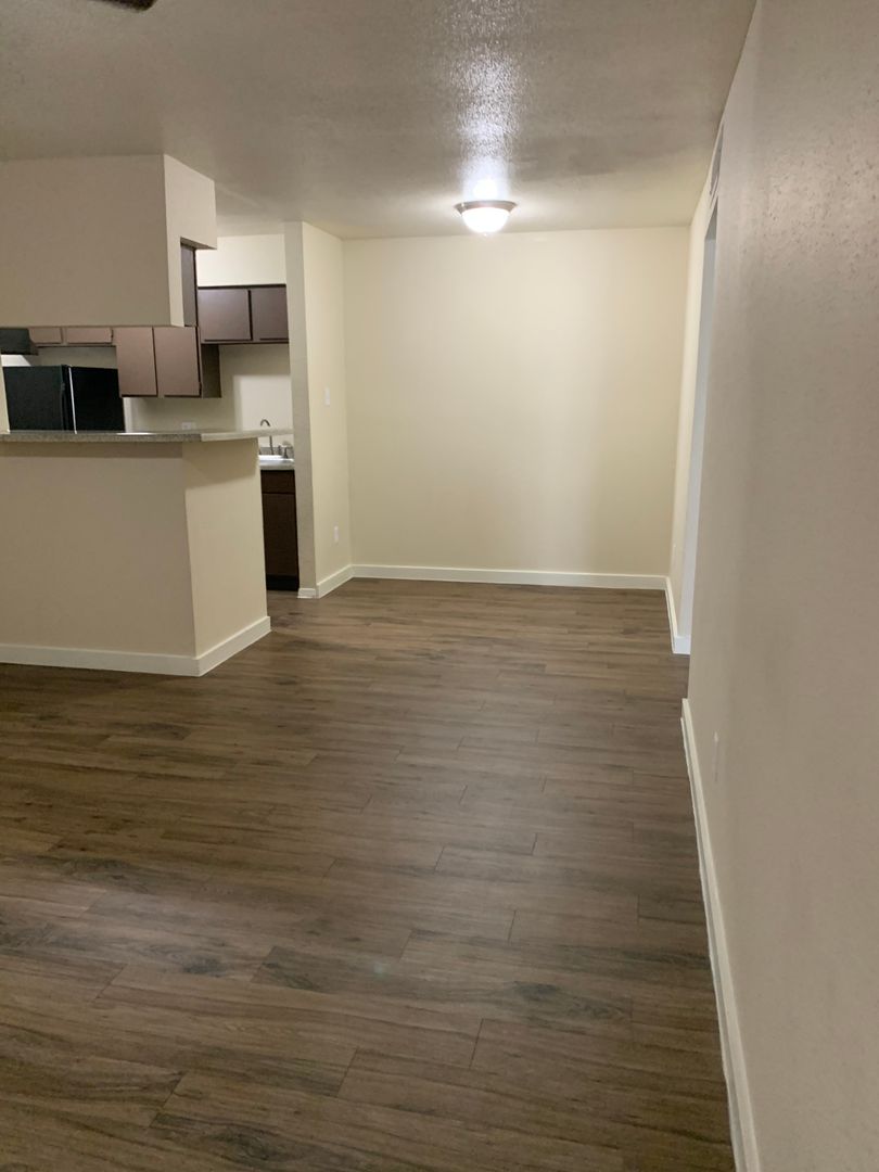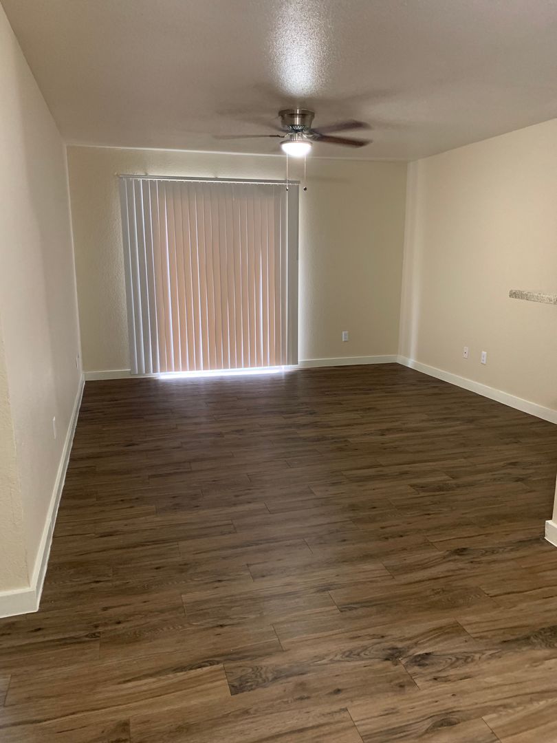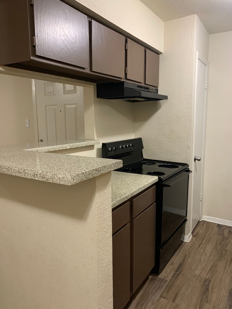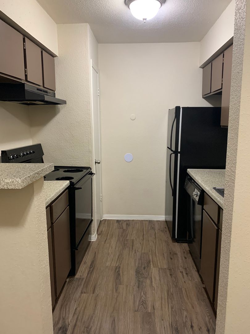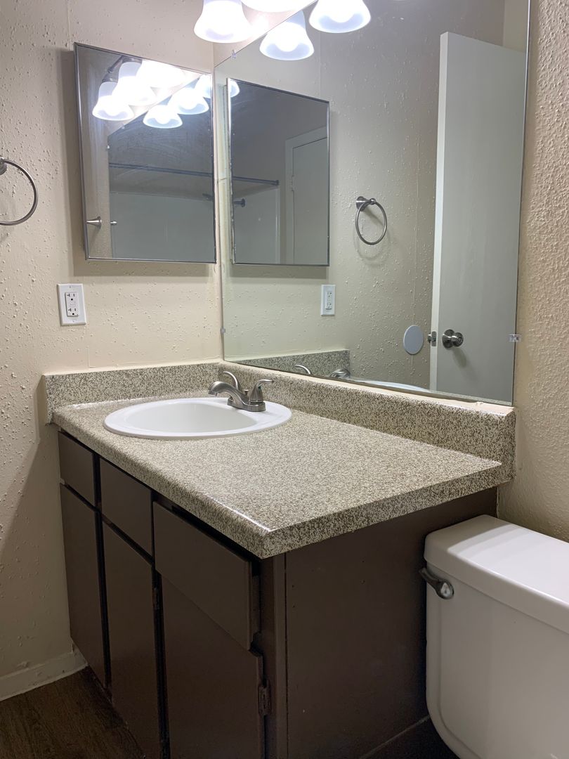 Our two-bedroom, one-bath units are an amazing 897 sq. foot of coziness. The open floor plan is spacious and has a patio right off the living room so there is plenty of natural light. The bedrooms are tucked away down the hall to create some peace and quiet when needing to relax. A guest bath in the hall boasts a shower/tub combo and offers an extra-long vanity along with a nice-sized linen closet.