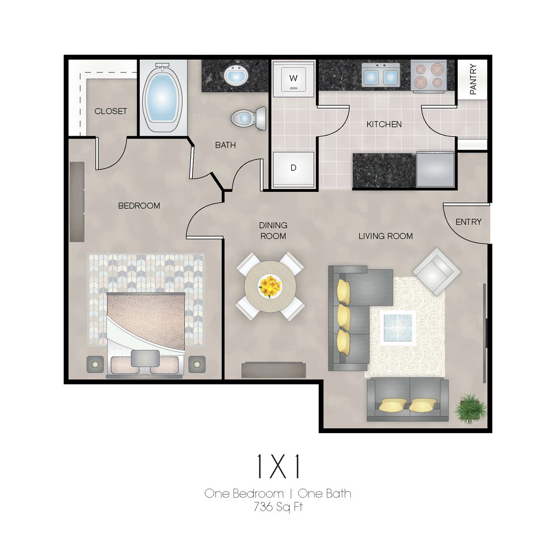 This one bedroom floor plan is the most budget-friendly home in our community! With 736 sq ft of interior living space and a personal, oversized front porch, the price and size are just right! Great value without giving up any of the sweet amenities!