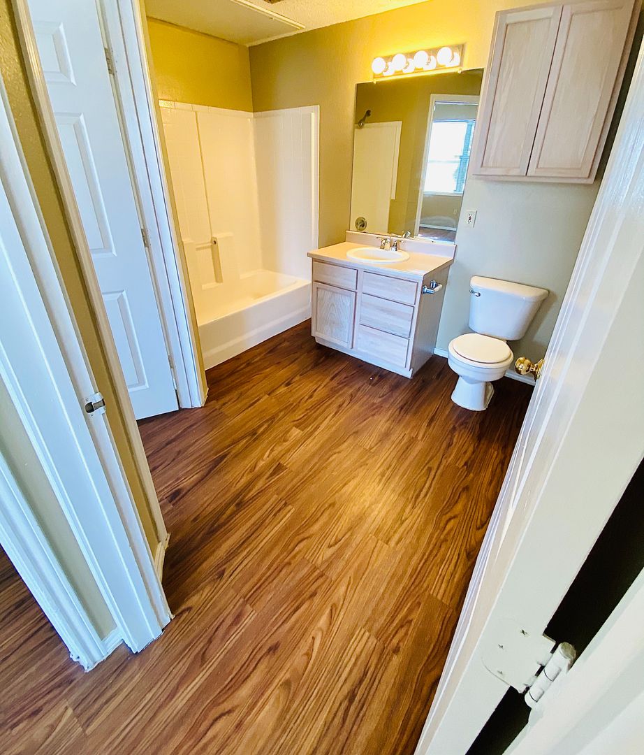The bedroom in each home is kept cool and bright with the help of another large window and ceiling fan. The huge closet and private bathroom are located in each bedroom. Hanging space is plentiful and each closet also features a top shelf for extra storage. The bathroom is the perfect size with a shower/tub combo so a relaxing soak or a quick rinse are both options after a long day! The cabinet storage under the bathroom vanity or the extra storage cabinet on the wall are designated spaces for bath towels or linens.