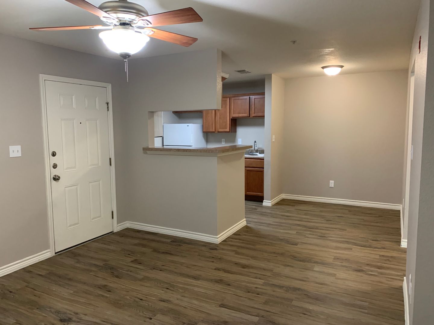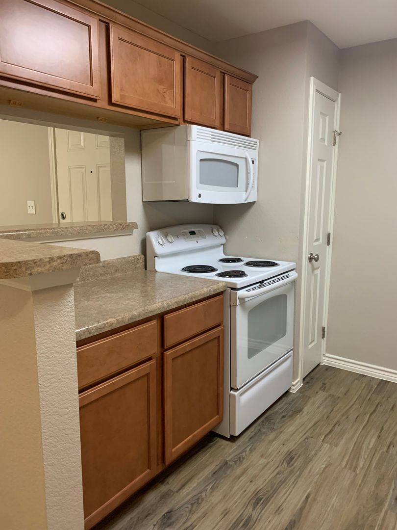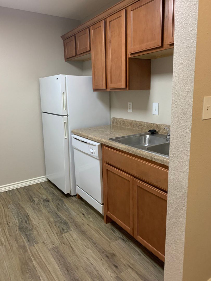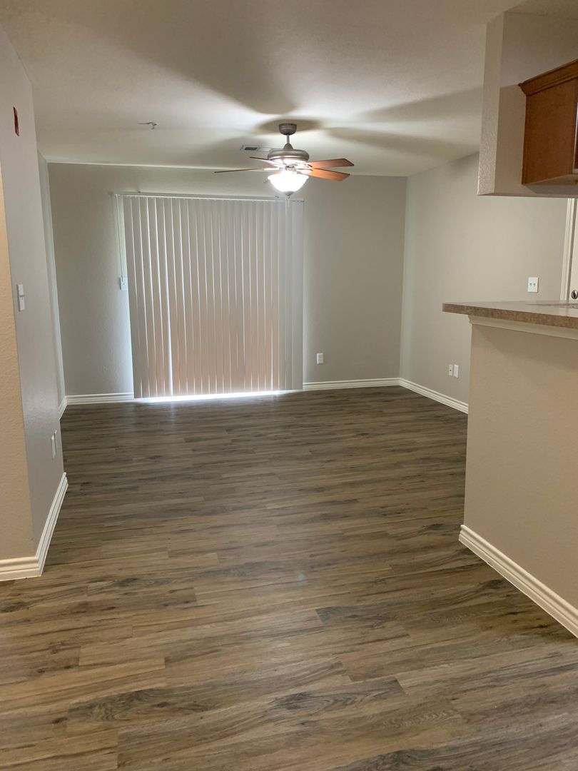 Our two-bedroom, one-bath units are an amazing 897 sq. foot of coziness. The open floor plan is spacious and has a patio right off the living room so there is plenty of natural light. The bedrooms are tucked away down the hall to create some peace and quiet when needing to relax. A guest bath in the hall boasts a shower/tub combo and offers an extra-long vanity along with a nice-sized linen closet.