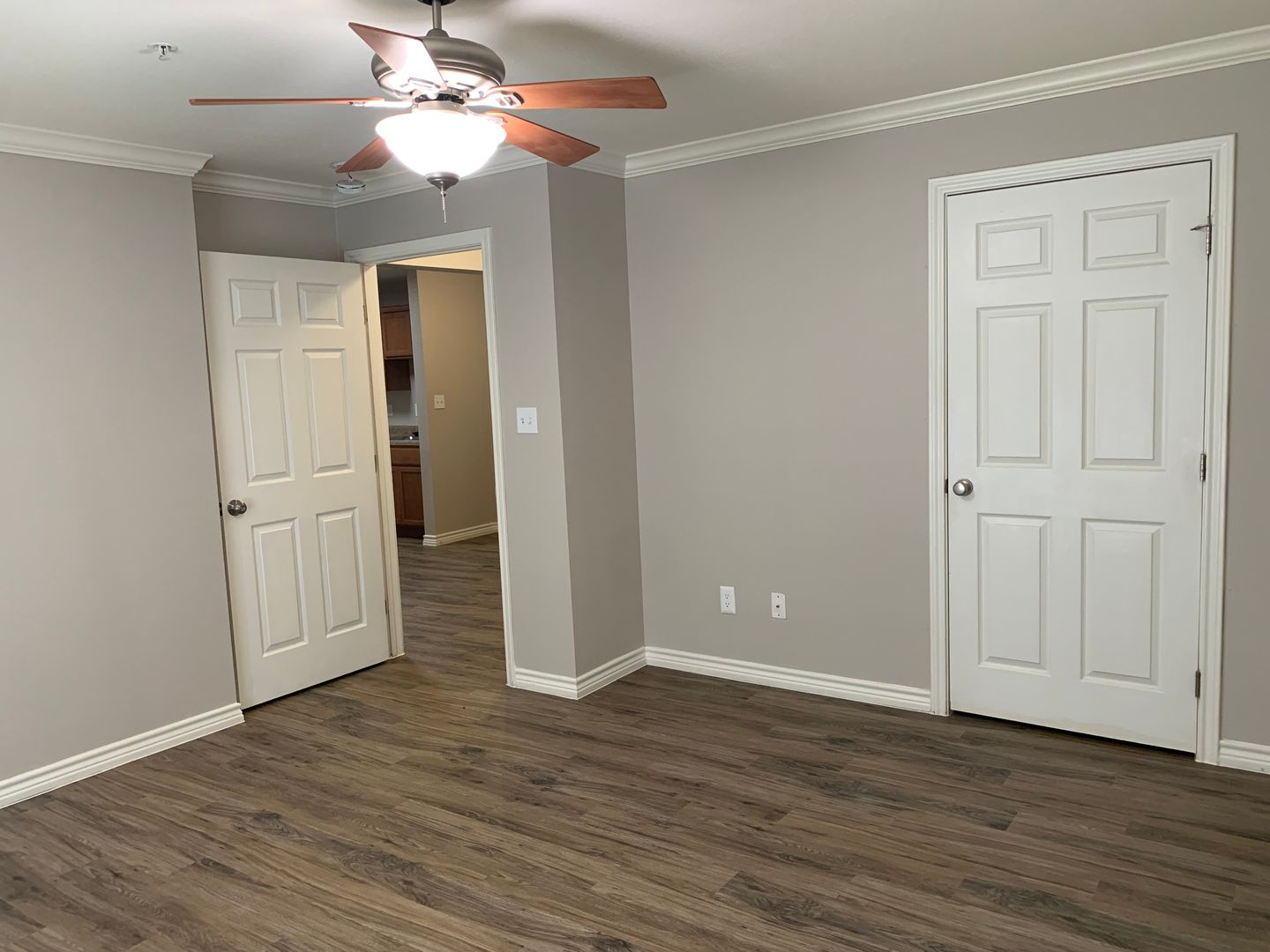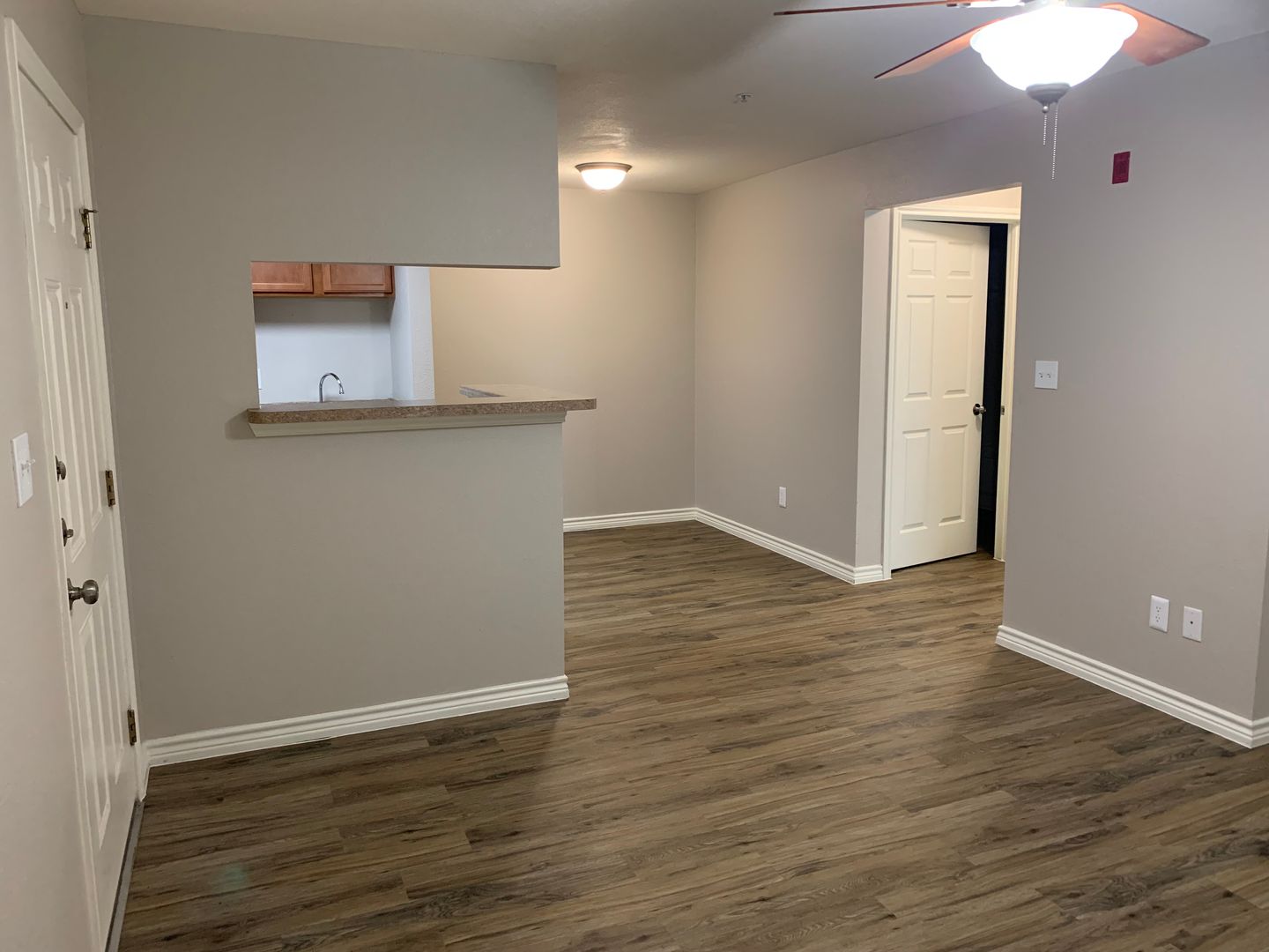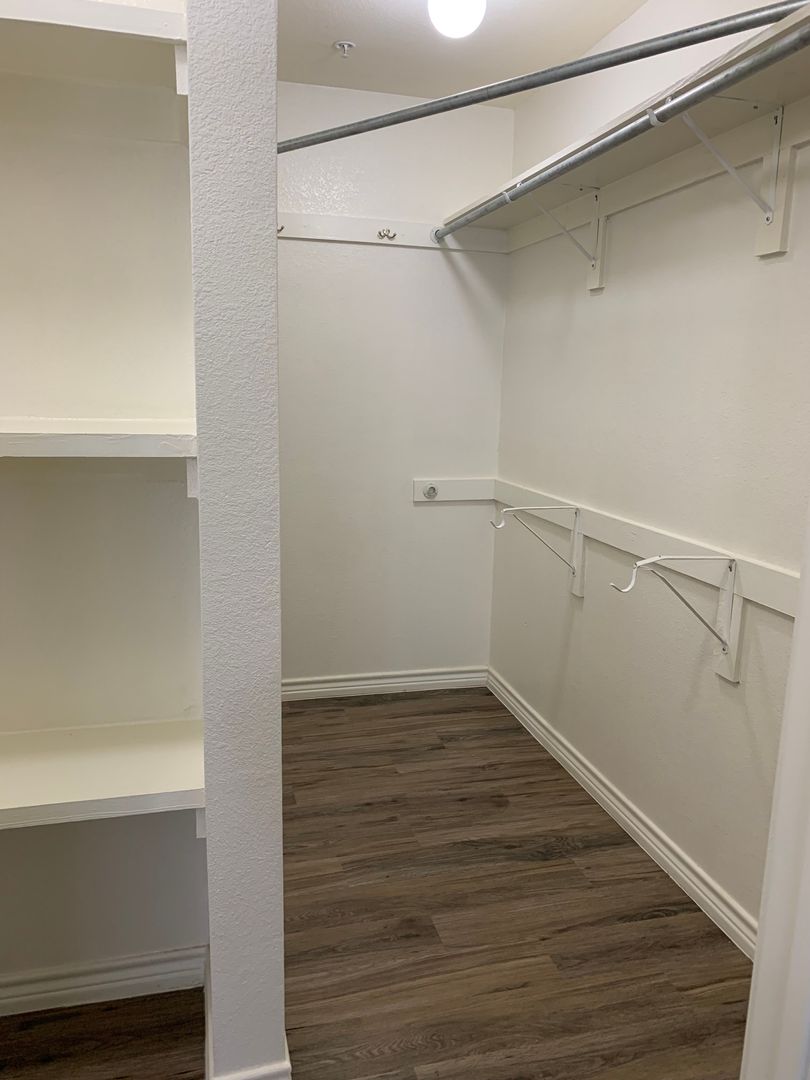 Choose from three different options in our 1-bedroom, 1-bath floor plans. The first is a cozy 543 sq. foot floor plan which has ceiling fans in both the living room and bedroom. The bedroom is spacious enough for a full-size bed with nightstands and a dresser. The large walk-in closet has plenty of hanging space and features a top shelf for extra storage.