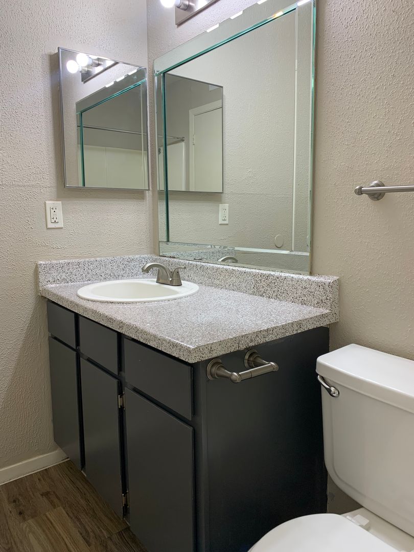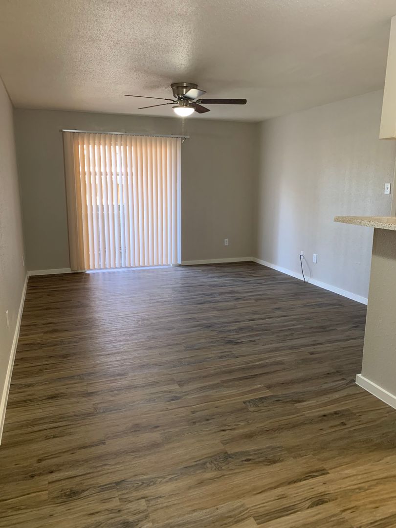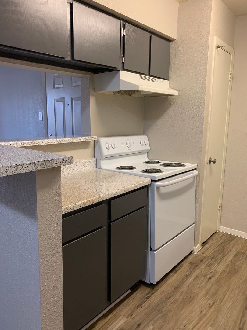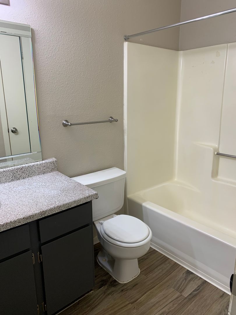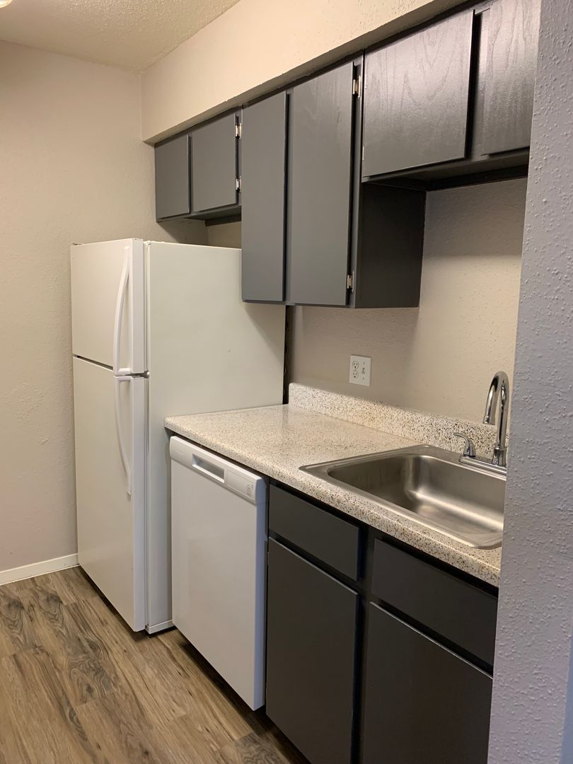 Our two-bedroom, one-bath units are an amazing 897 sq. foot of coziness. The open floor plan is spacious and has a patio right off the living room so there is plenty of natural light. The bedrooms are tucked away down the hall to create some peace and quiet when needing to relax. A guest bath in the hall boasts a shower/tub combo and offers an extra-long vanity along with a nice-sized linen closet.